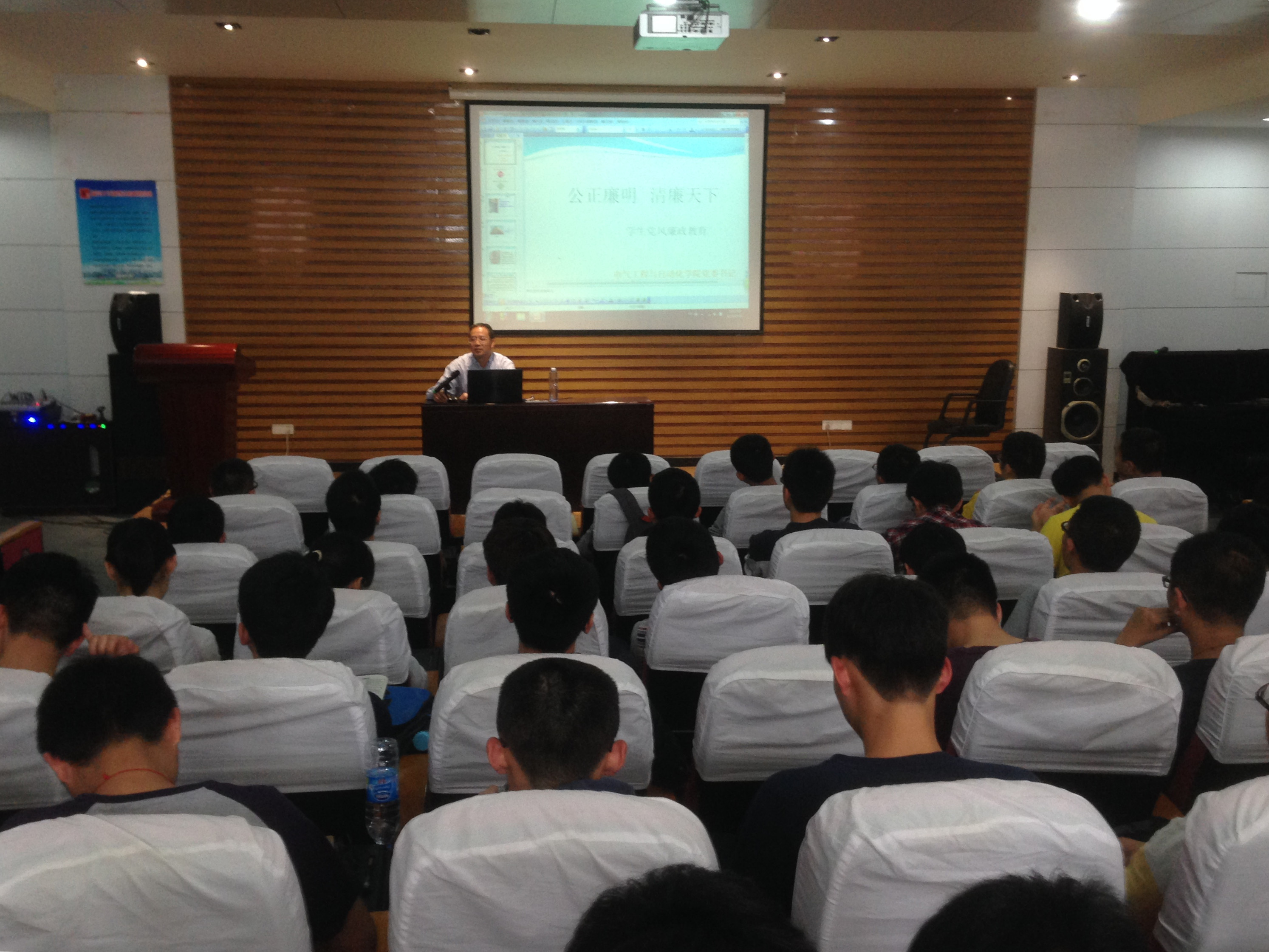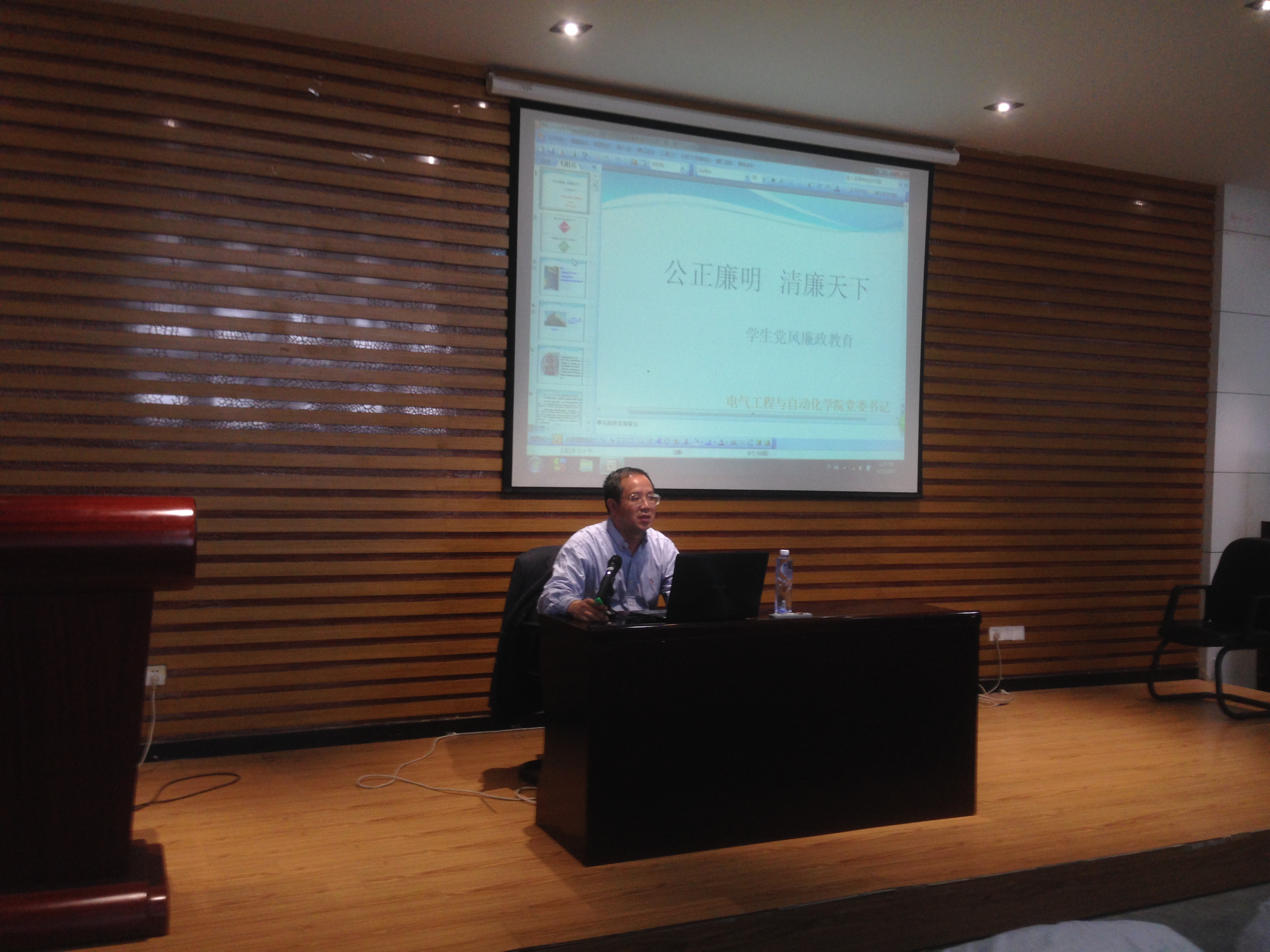 本次讲座的主题是:公正廉明,清廉天下。讲座过程中,何书记首先强调党风廉政建设不仅关系到千家万户,也影响着我们的党风、民风、作风。何书记指出,如今社会上的“特权”思想正在逐步瓦解,从前对干部子女的“关照”慢慢变成了“光照”。他强调只有廉洁、透明的社会才是自由的社会,因此作为入党积极分子,应当摒弃这种落后思想。随后,他还介绍了现今廉政工作的四个重点,提醒入党积极分子要紧随时代的步伐积极投入到党风廉政建设的工作中来,并在此过程中找到人生的价值所在,端正人生态度。在讲座接近尾声的时候,何书记举出了一系列反腐案例,告诫在座入党积极分子必须始终做到守纪律,遵法度。何书记内涵丰富,意义深刻的讲话赢得了在座同学热烈的掌声,最后讲座圆满落幕。