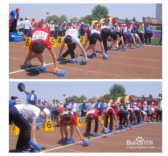 3.比赛赛制:比赛开始前,第一个参赛队员立于起跑线后的第1、2块河石上,手持第3块河石。裁判发令后,队员依次将河石踩在脚下交替向前行进。以参赛队员的任一脚踩在越过终点线的河石上为计时停止。越过终点线后把河石传给终点的另一个队员,依次循环进行,直至6名队员全部完成,计时结束。注意,在传球的过程中,哪个队员没有踩在河石上,要从起点重新出发。