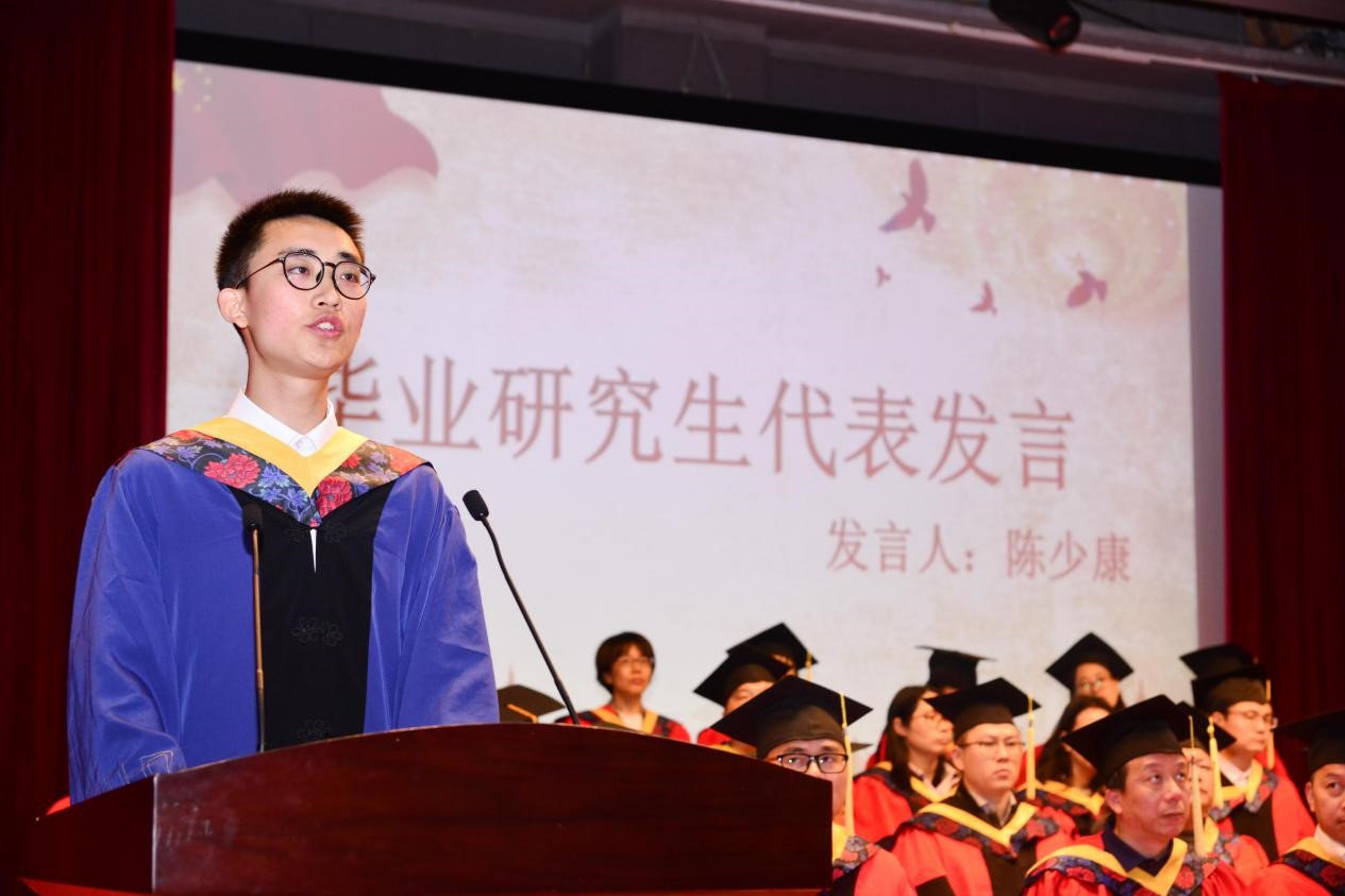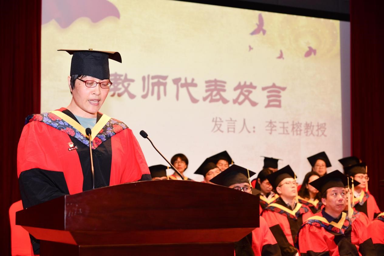紧接着教师代表李玉榕教授发言,在同学们即将踏出校园,进入社会之际,李老师向同学们表达嘱托和期望。希望同学们珍重自己的身体健康,管理好自己的时间、精力和情绪,调整好自己的心态,才能规划好自己的人生;其次珍重自己的激情和理想,只有保持住自己心中对生活的一份热度,才能作为一个学习的行者,不断地自我更新、升级,主动适应社会需求,脚踏实地的向前迈进;再次珍重自身知识的运用、才华的发挥。要牢记并践行“明德至诚·博学远志”的校训,不但要有身体、心理的健康,社会适应良好,还要保持道德健康!谨记“君子有所为,有所不为”!