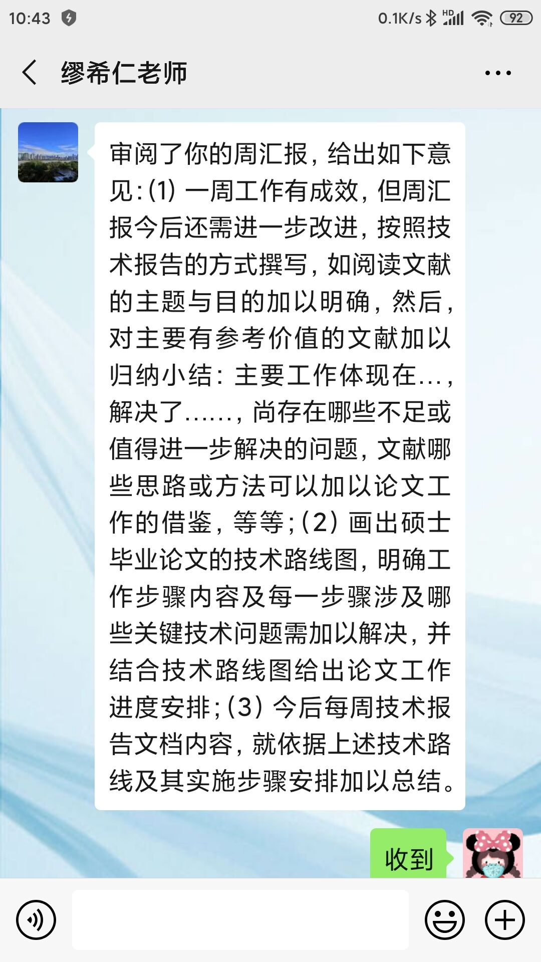在疫情期间开展科研工作,缪老师要求我们每周以工作汇报的形式详细汇报研究进展,这样有助于梳理和总结一周下来的科研内容,也更加明确下一步的研究要求。缪老师会认真查阅周汇报,并且给出详细的指导要求,以毕设研究思路为中心进行阶段性工作的指导,在我研究出现偏差时及时给予指正。