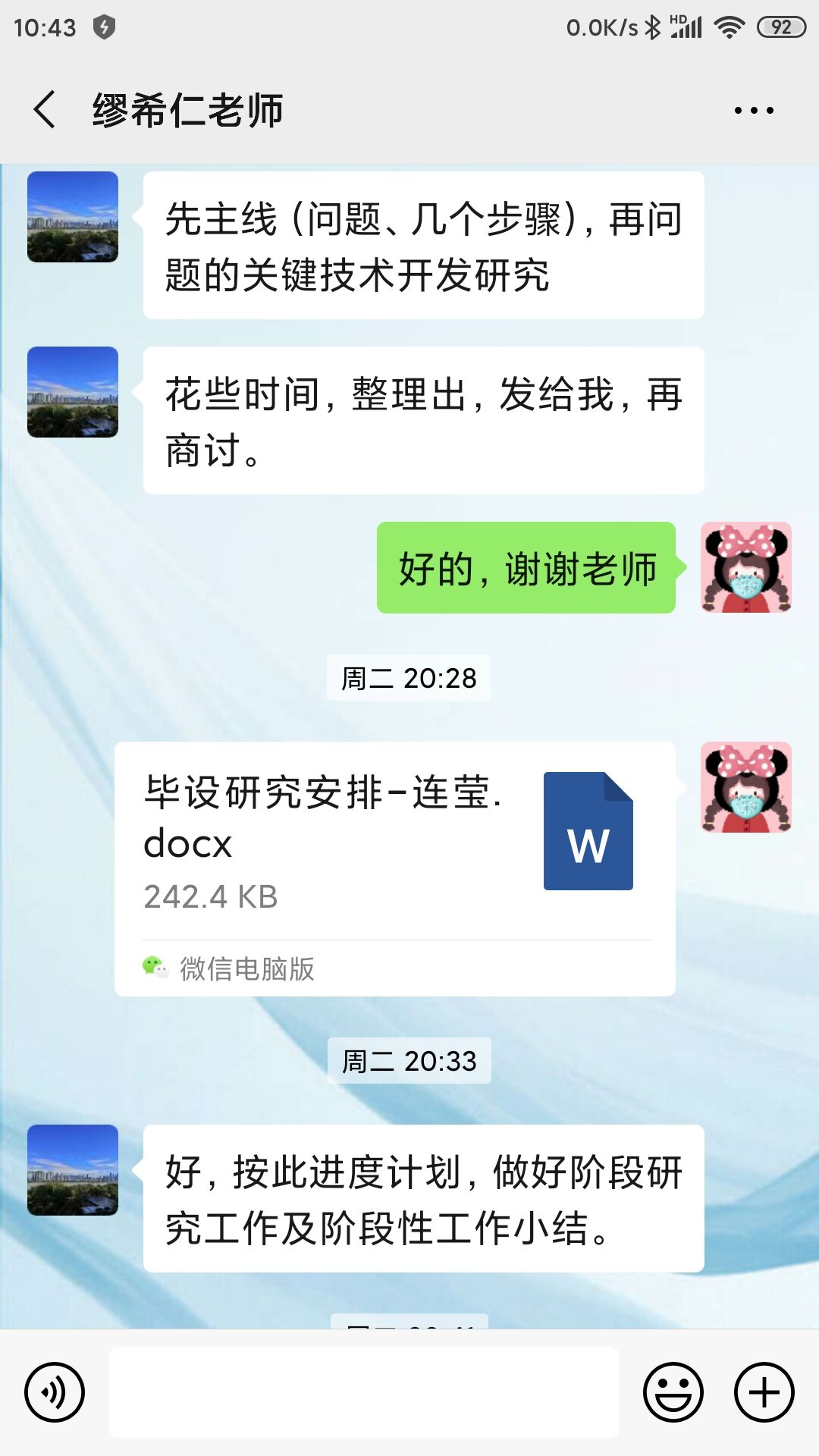 虽然,由于疫情的影响,还未开学。但是,休学不停学,不能耽误科研进度,在家也一样能学。林老师,总是很耐心的解决我的问题,经常询问我的科研进度。遇到难题,引导我共同解决。指导我写开题报告,把握我毕业论文大体方向。尽管,有些实验不能进行,但在家里可以先把需要的理论计算理论推导做好,可以多看看论文,也可以写写自己的小论文。要及时向老师主动汇报,多沟通,即便不能和老师当面交流,也能通过聊天,视频,解决很多问题。