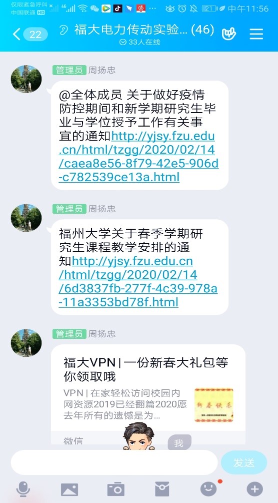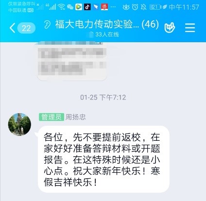 突如其来的疫情打乱了人们的生活,也打乱了每个人的学习计划。但是在疫情发展之初,周扬忠老师便发出了不要提前返校的提醒和学校公布的文件,以提醒我们各类注意事项。通过QQ群聊的方式,周老师统筹安排我们硕士生和博士生的学习规划和进展,研一好好上网课,研二写开题报告,研三准备答辩ppt,博士修改小论文等等。并根据每个人所提出的不同科研问题,通过私聊、电话等方式逐一解决。此外,还定期视频会议促进课题组内部的学术交流和问题探讨。这不仅帮助我们及时调整在家中的学习状态,而且也推进了科研进度。