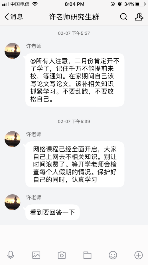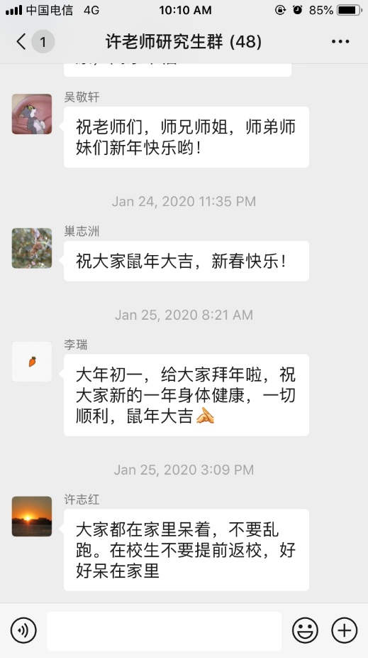 受疫情影响,全国各地高校陆续延迟开学。许老师强调必须遵循学校部署,不得提前返校,保证好身体健康,助力全国疫情防控行动,再三叮嘱 “延期开学、不停学、不停研”,并确保每位团队成员通知到位。