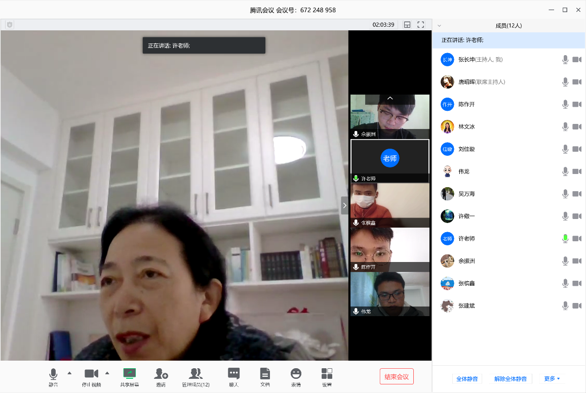 随后许老师采取单独汇报与每周大组汇报相结合的方式。通过单独汇报方式,及时掌握各学生的健康、学习、科研动态的基础上,结合线上每周大组汇报的方式,促进课题组各成员之间的相互学习,稳步推进学生学业的进展。