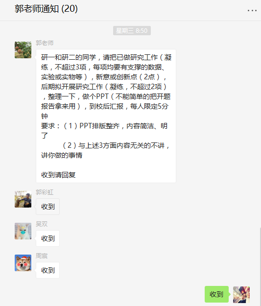 研究生工作总结汇报计划是每个研究生不可或缺的工作,研究生通过总结并汇报自己的研究进展,有助于已研究内容的升华,从而推进后续的研究工作。郭老师考虑到了研究工作总结汇报的重要性,在寒假期间,通过微信群聊的方式给同学们布置任务,鼓励同学们勇于总结,细心地提醒同学们在研究工作总结过程中需要注意的部分,并要求同学们通过制作PPT的方式完成汇报。同学们仔细阅读郭老师提出的要求,用心制作PPT,争取通过最简洁明了的方式完成汇报。