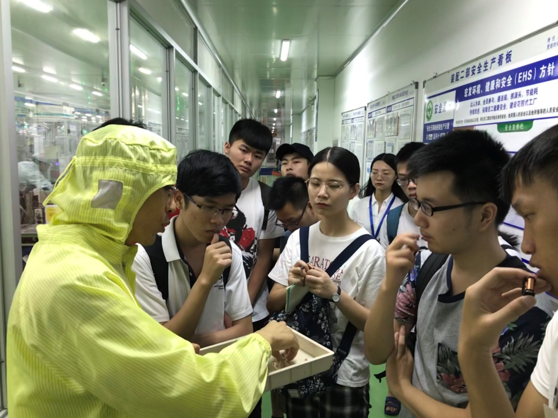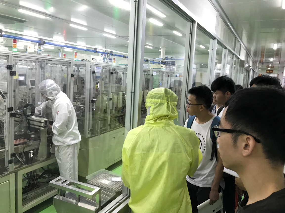 7月9号上午,在宏发本部实践的队员们在技术部黄智明老师的带领下,参观了装配车间HF118F以及HF161F两种产品的整个生产过程:插装→点胶→装推块→塑封→沾锡→电气检验→包装,平均一条流水线配备两到三个工人,装配车间的每一台机器都处于一个密封的环境下,降低噪声污染以及防尘。为了防止继电器因灰尘导致断路等问题,工人全部带了手指套,只有严格的质量指标检测以及不断提升产品质量,利用科技创新产品的产量效率,从细节做起才能实现中国制造由大变强的战略任务。