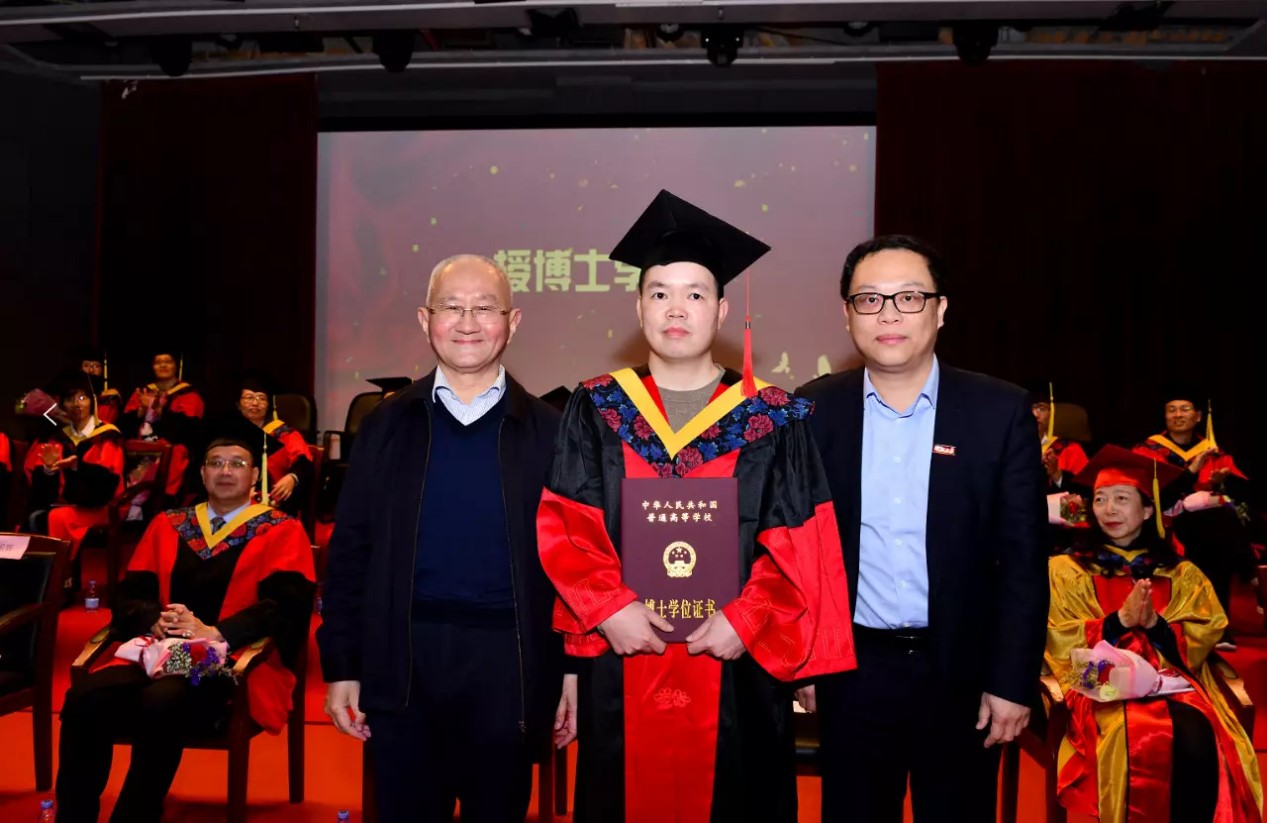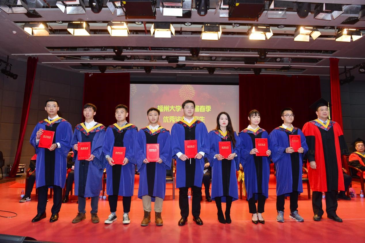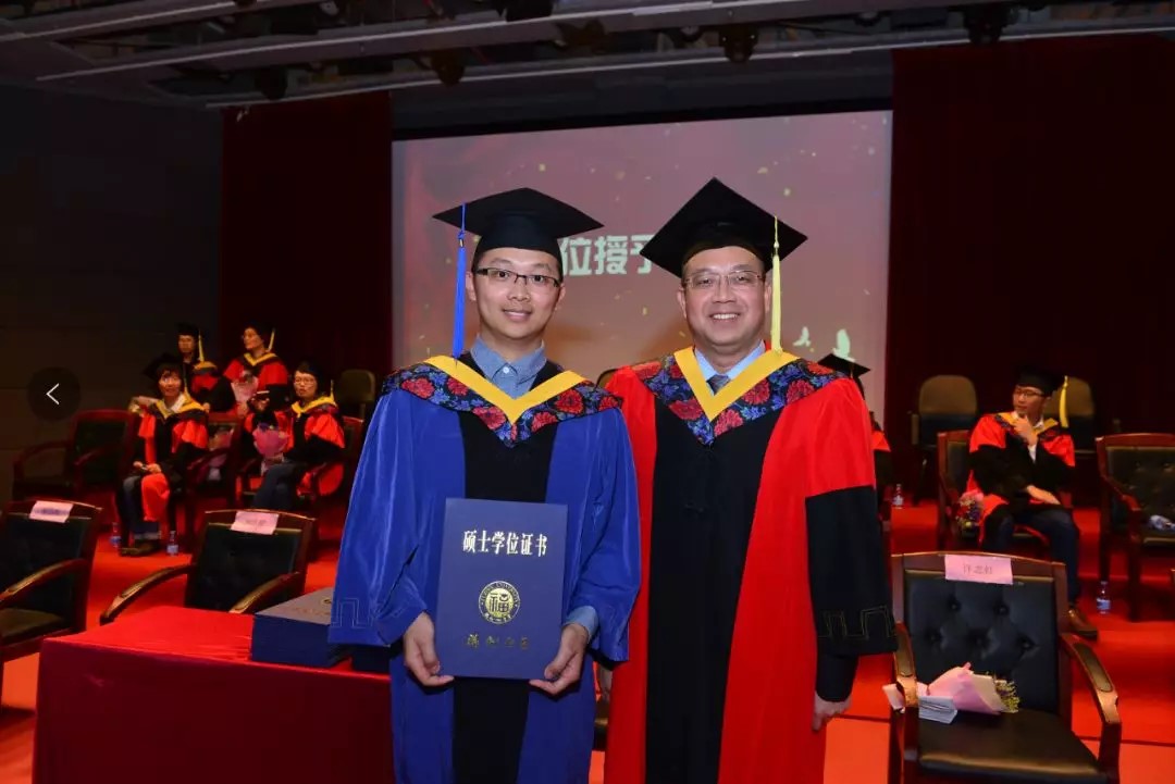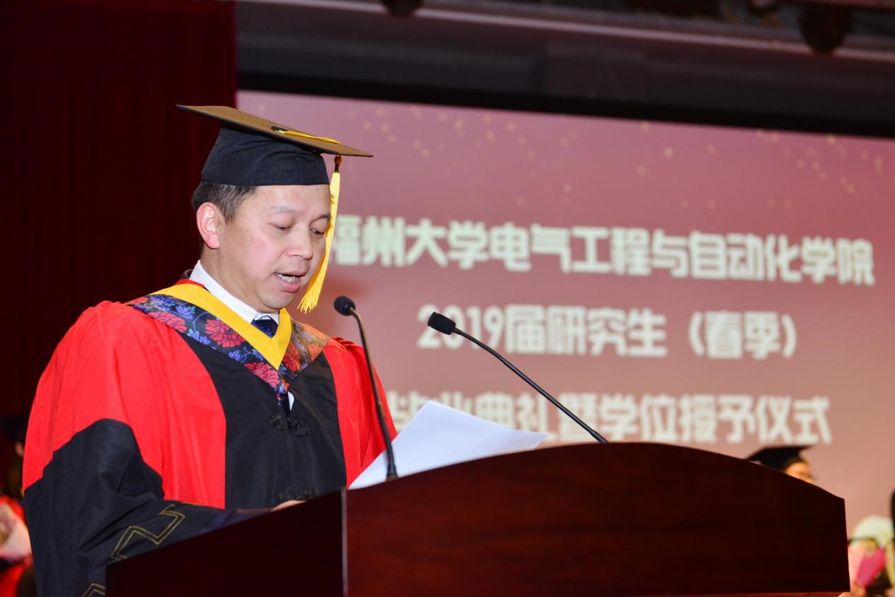 典礼伊始,在优美的交响乐《沃尔塔瓦河》的乐声中,同学们庄严并立在红地毯两侧,手捧鲜花欢迎导师们入场,并向恩师们献上自己精心挑选的鲜花。伴随着鼓舞人心的国歌声,毕业典礼暨学位授予仪式正式拉开帷幕。首先是副校长杨黄浩教授致辞,杨校长期望我们能够永葆自己的先进性,发扬“福大明德至诚,博学远志”的校训,实现“达则兼济天下”的理想,为社会和国家贡献自己的才能。第二项议程是薛禹胜院士寄语,薛老语重心长地讲述自己年轻求学的种种经历,教诲我们年轻一代要珍惜现有的大好条件,刻苦努力,不忘初心。随后,薛老亲自为毕业生汤云东博士执拨穗礼,杨校长为其颁发了博士学位证书。伴随着鲜花,学生代表在台上朗诵了一首《三月春风》,为毕业生送上了最美好的祝福。