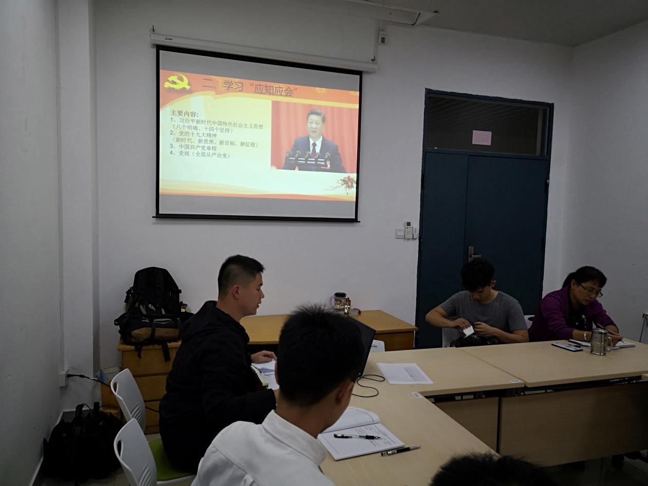 会议伊始,支部书记曾峰同志向新加入支部的党员介绍了支部的基本情况,为加强支部党员之间的交流,新老党员分别自我介绍,以便相互认识。紧接着是进行支部党员共同学习“习近平新时代中国特色社会主义思想和党的十九大精神应知应会知识汇编”的环节,曾峰同志对学习内容进行了详细讲解,带领全体党员学习八个明确,十四个坚持的基本方略,重温党的十九大精神。并要求各位党员同志应积极主动学习“应知应会”的相关内容,牢固树立“四个意识”,坚定“四个自信”,在科研生活中发挥党员的先锋模范作用,以新党章为考量争做一名优秀的共产党员。书记强调全体党员同志应在保持原有理想信念的基础上进一步磨练自己,让自己在各个方面得到全面发展,不仅要有理想,还要有与之相匹配的担当与实干。