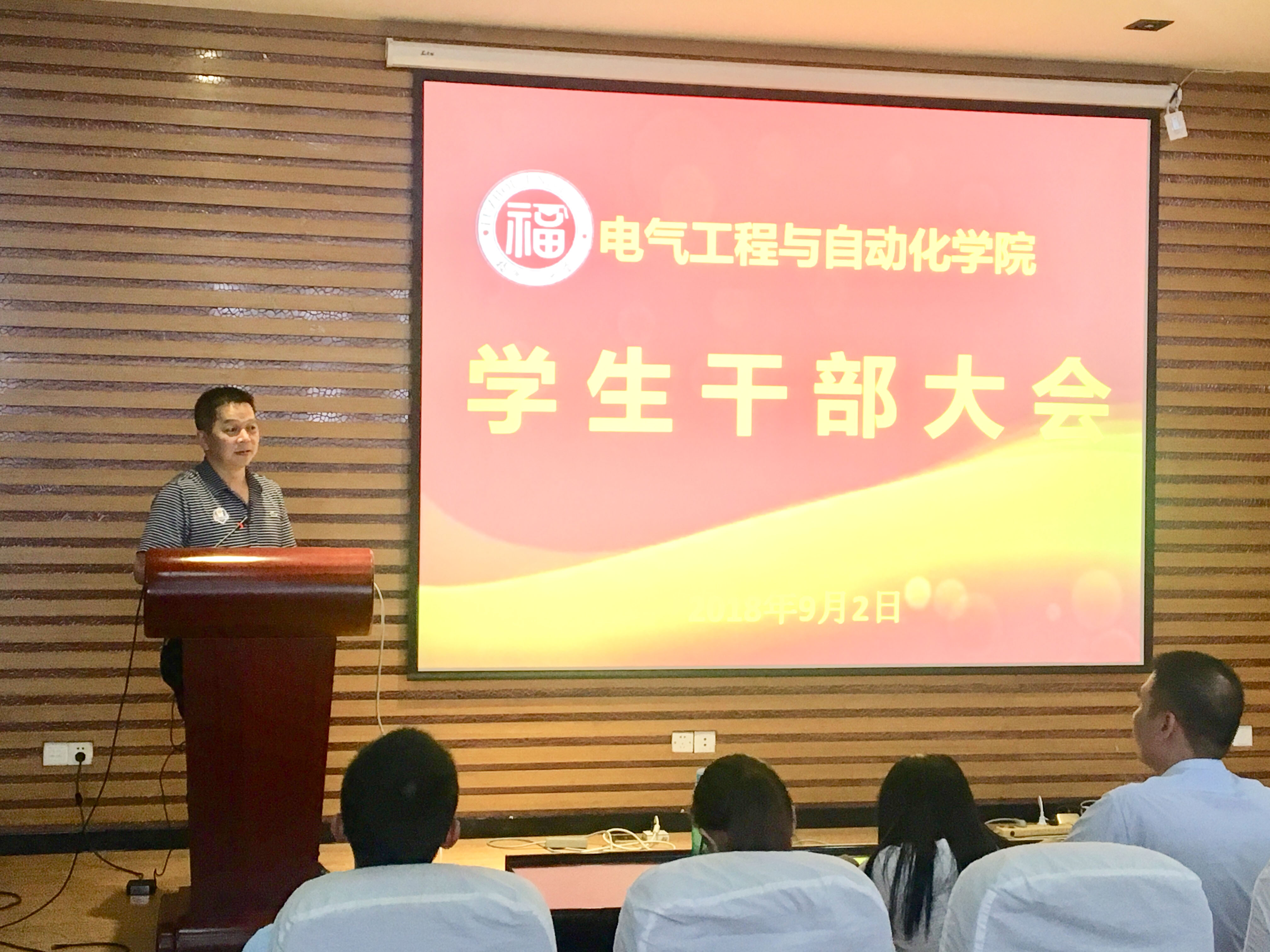 接着,院党委副书记黄国辉老师对学院学生工作进行了相关部署。黄书记强调了迎新工作的相关事项,对学院上学期的思想政治工作进行了总结并进行了总体部署。随后,黄书记与同学们分享了自己暑假在南洋理工大学的研修心得,希望在座的每位同学都能更有目标感,更有自信,培养一个让自己受益终生的体育爱好,培养深厚的爱国主义情怀。他对新学期的学生工作寄予了殷切期望,希望同学们能够撸起袖子继续加油干,努力工作。