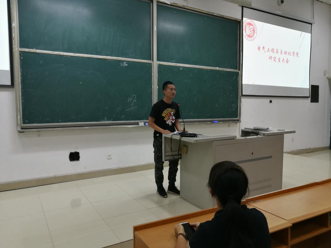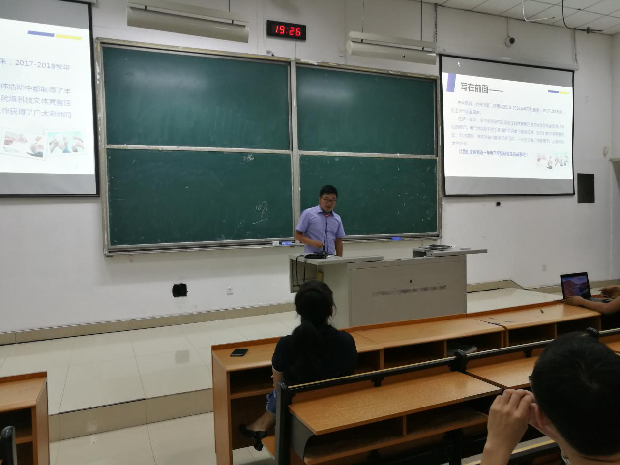 接下来由上一届研究生会主席张旗作了述职报告,张旗主席讲起研会一年以来的工作如数家珍,从自己带队参加研电赛到2017级迎新活动,从恒峰科技月活动到各专业学术沙龙,从毕业典礼、毕业晚会到承办校级活动——“我和我的国奖风采展”,再到学生干部素质拓展等。大大小小的活动无一不体现了研会各部门、各党支部的努力与支持。