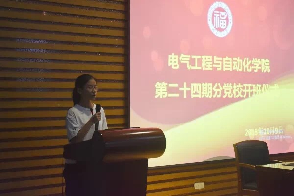 首先,由2018级电气三班的尤瑞珠同学作为学生代表上台发言。她表达了作为入党积极分子对加入共产党的热切期许和对党的认识,并号召同学们端正入党动机,以党员的标准要求自己,并且认真对待这一次来之不易的党校学习机会。