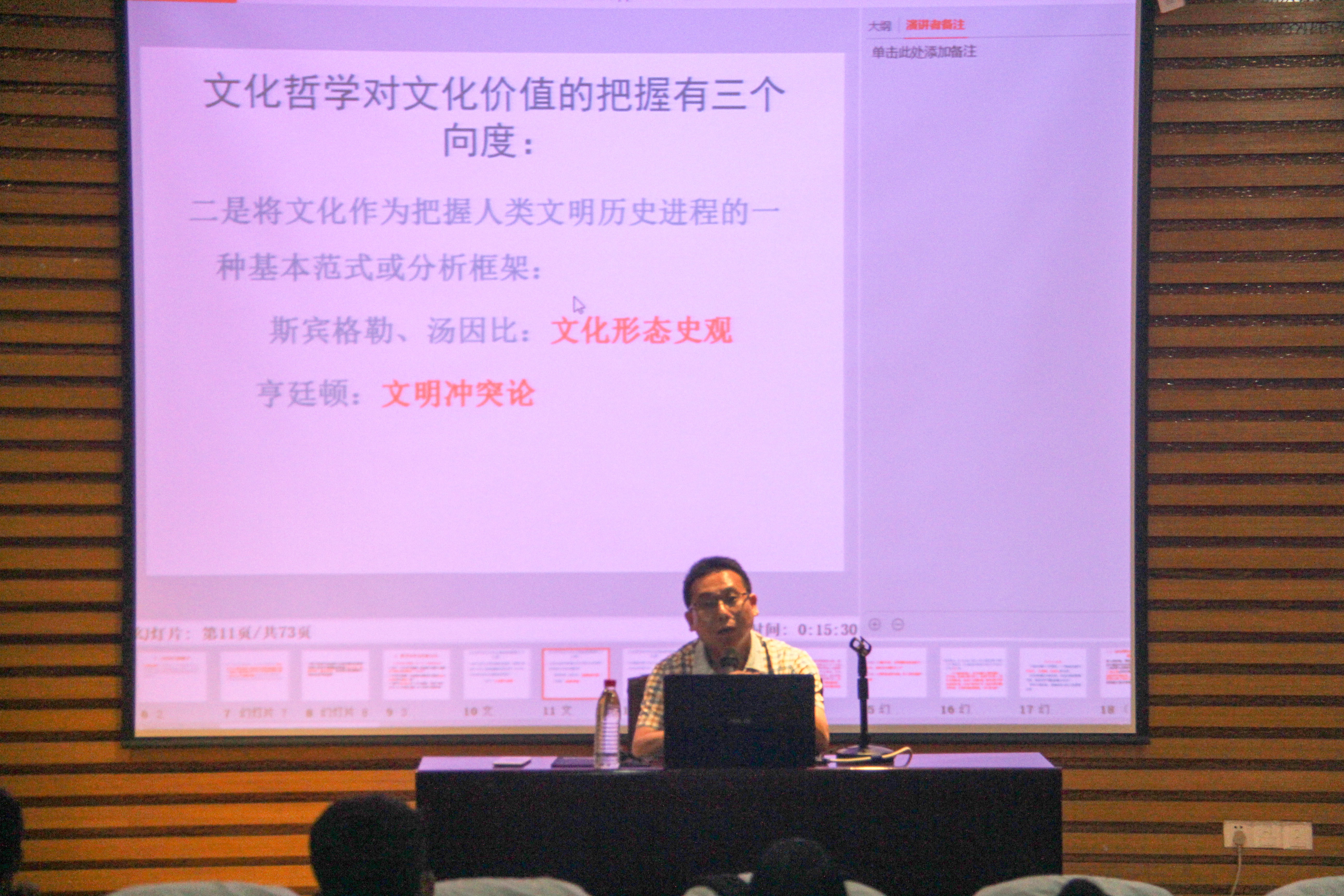 黄老师结合古今中外历史,首先对文化自信的内涵进行讲解。他从我国古代天朝之国开始到近代西方侵略史、新时期的“国学热”等不同时期下出现的“文化自大——文化自卑——文化自信”的发展历程进行详细讲授。紧接着,黄老师从历史逻辑出发,强调习近平总书记对中华优秀传统文化的创造性转化和创新型发展的伟大意义。最后,黄老师总结了习近平总书记用典中体现的以人民为中心、发展法治思想以及构建人类共同体的核心思想,引导同学们要时刻坚持不忘本来、吸收外来、面向未来的文化自信。