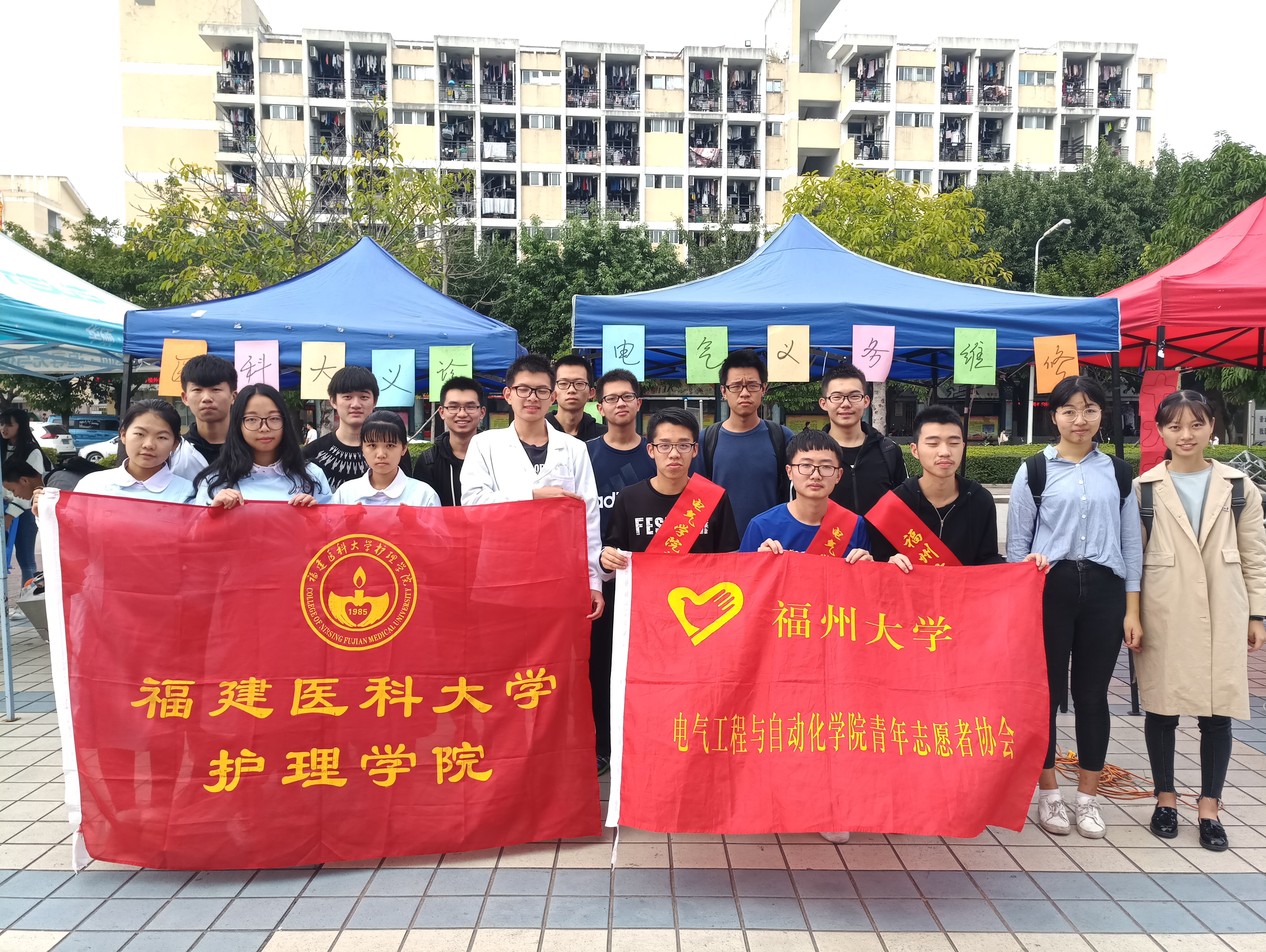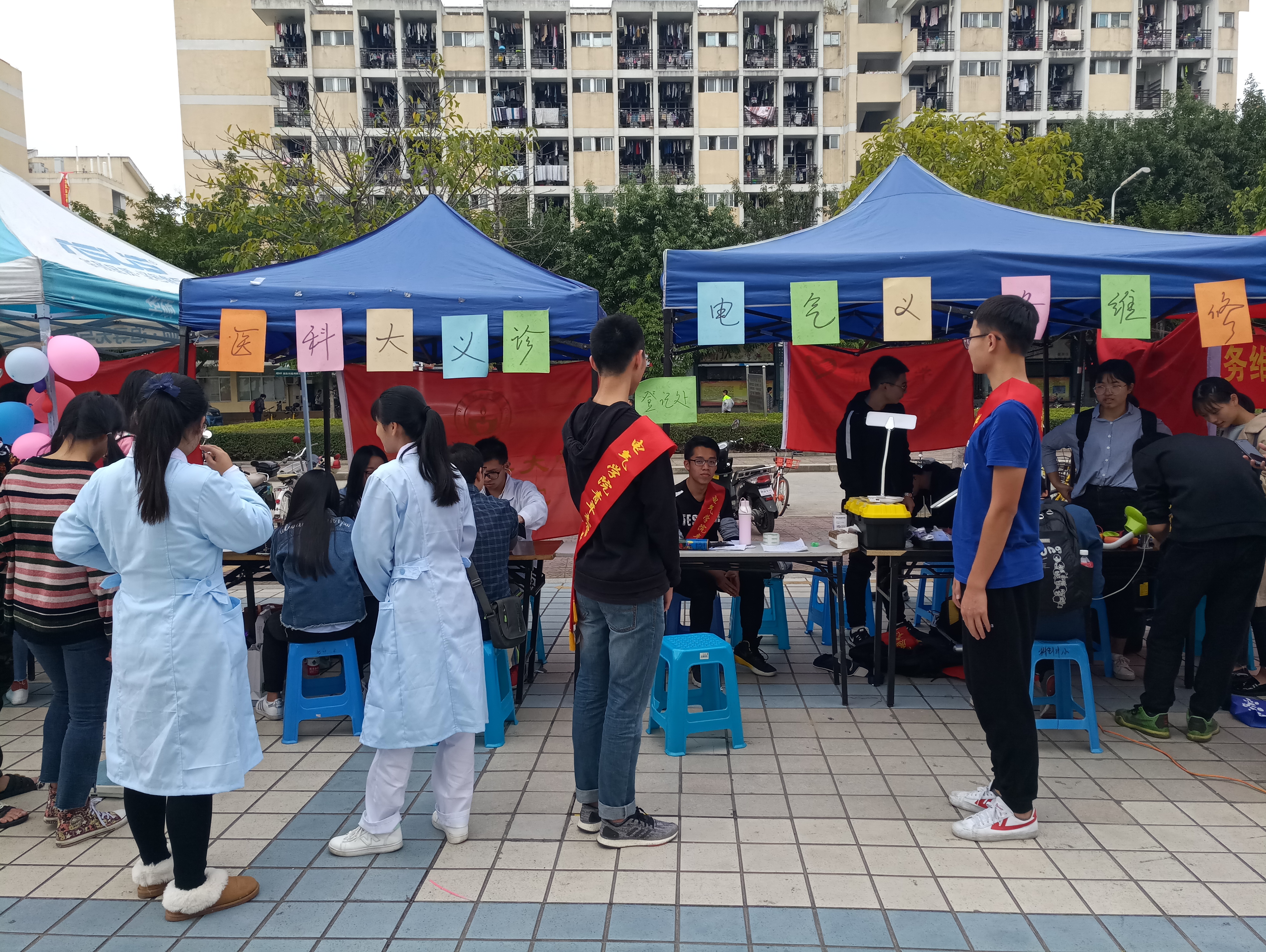 青年志愿者协会协同福建医科大学护理学院青年志愿者协会在青春广场举办义务维修、义诊活动。