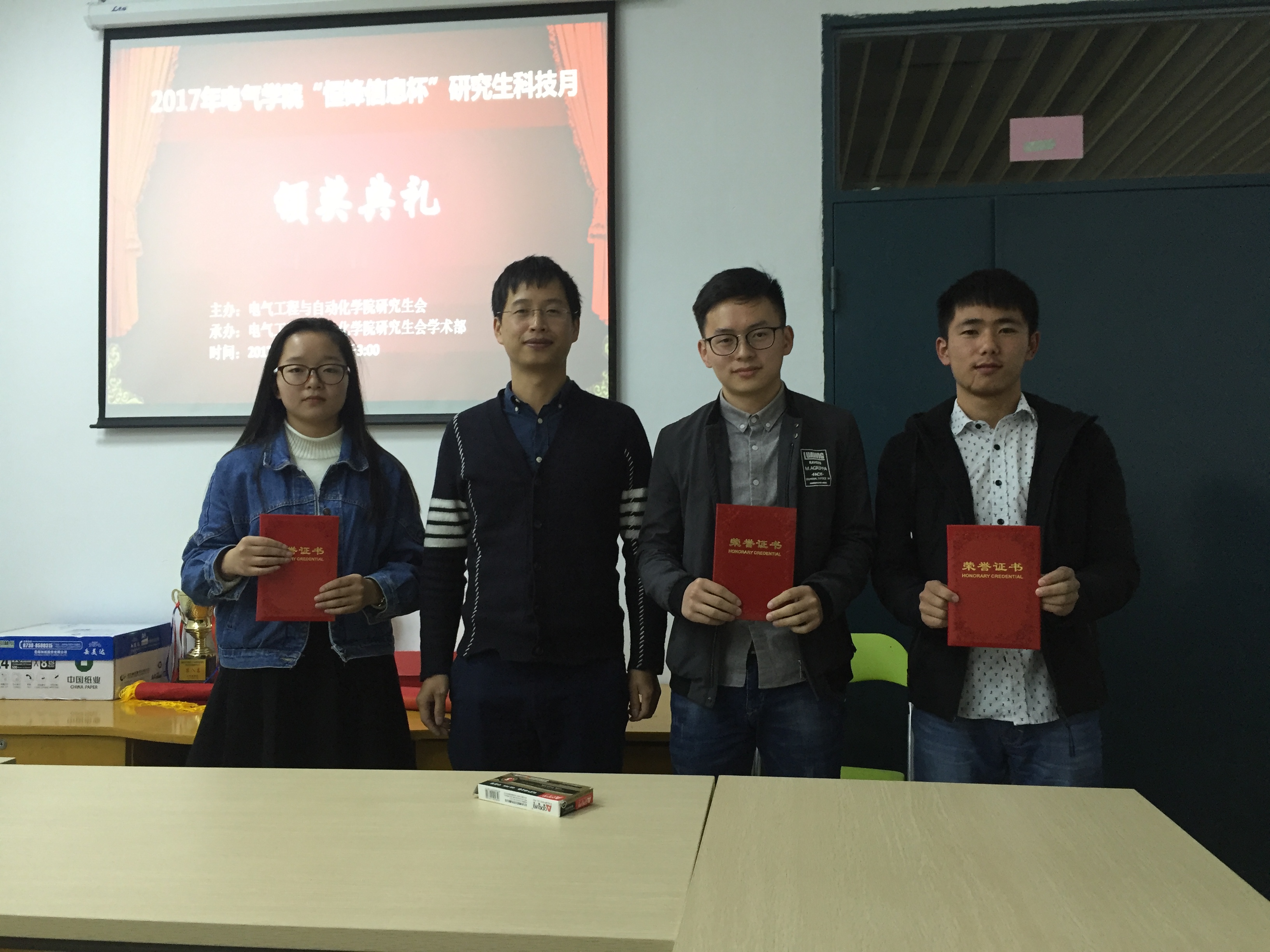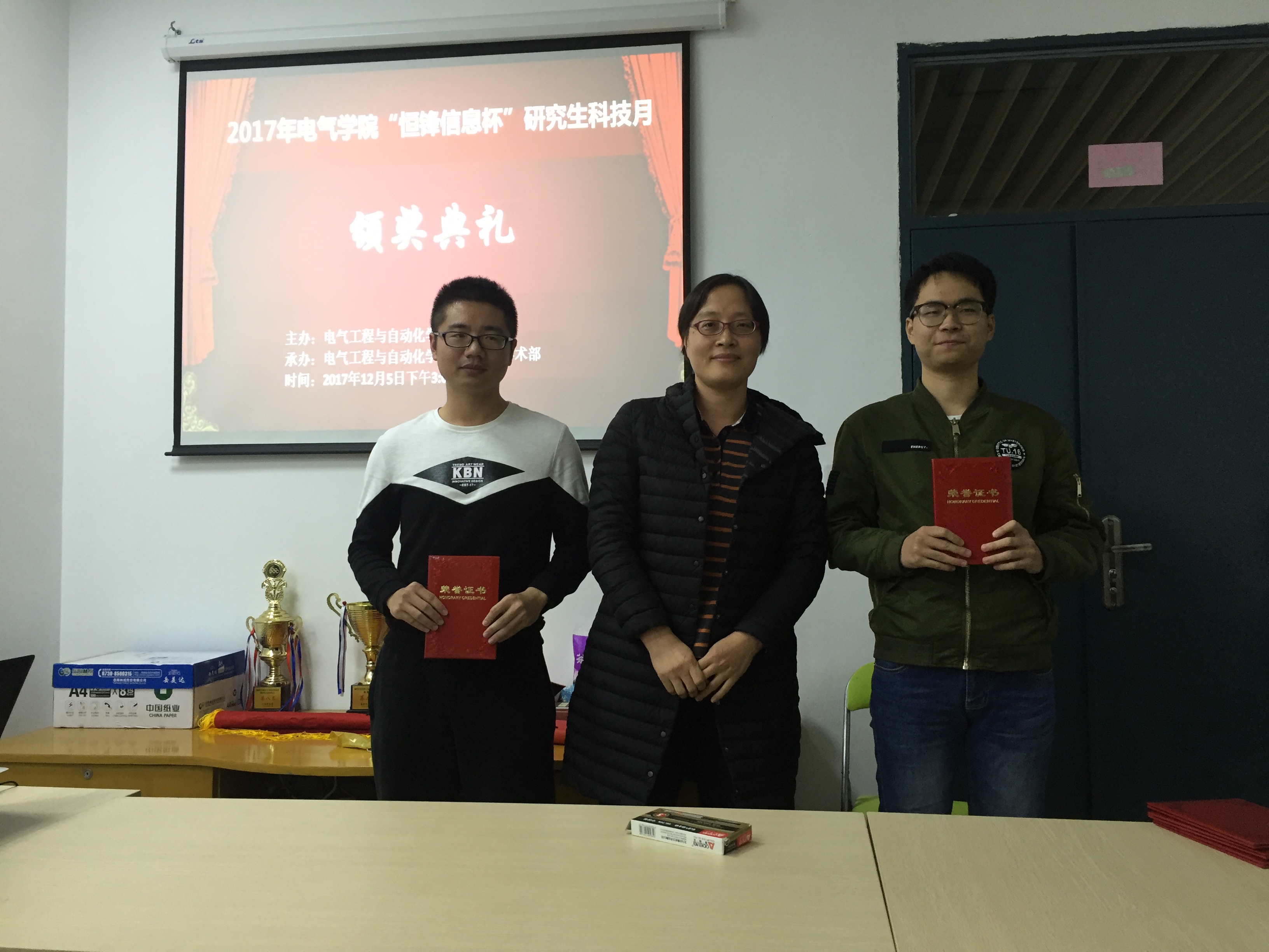 获一等奖的队伍一支,题目为:“单逆变器供电双五相永磁同步电机串联型直接转矩控制研究”,团队成员:吴鑫、韩成建、陈贤达。