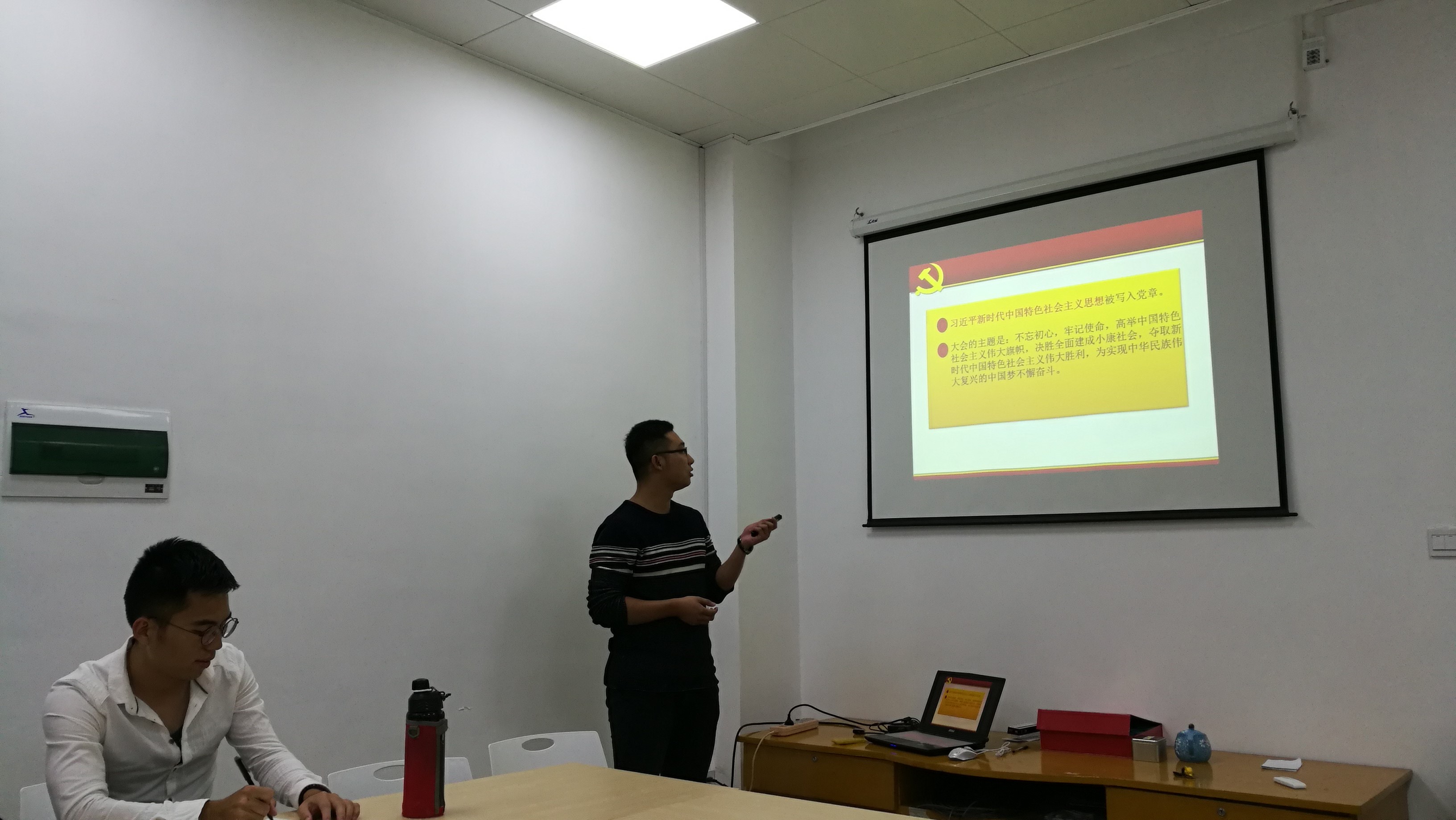 首先,支部书记黄李威同志简单介绍了电机电器研究生党支部的基本情况,新老生党员互相进行自我介绍和交流。紧接着,支部就十九大精神和新时代中国特色社会主义思想进行学习。之后,党员研究生代表进行了十九大精神学习心得进行了PPT学习交流。党员同志们分为小组对各位研究生代表的PPT及十九大精神进行了深入的讨论交流,并发表看法,认为研究生党员在科研工作中要不忘初心,联系实际,发挥创新能力。同志们一致认为研究生党员应加强十九大精神的学习领会,了解党的领导集体,深入理解党的方针政策。