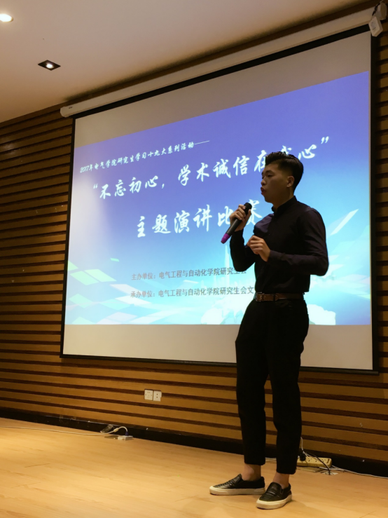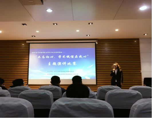 在新楚楼北230举行研究生学习十九大系列活动—“不忘初心,学术诚信在我心”主题演讲比赛。出席本次活动的嘉宾有我院研究生辅导员许海燕老师、电机电器研究生党支部书记黄李威同学以及曾在校演讲比赛中表现优异的陈韬珉同学。比赛由2017级硕士研究生黄炎尧主持。