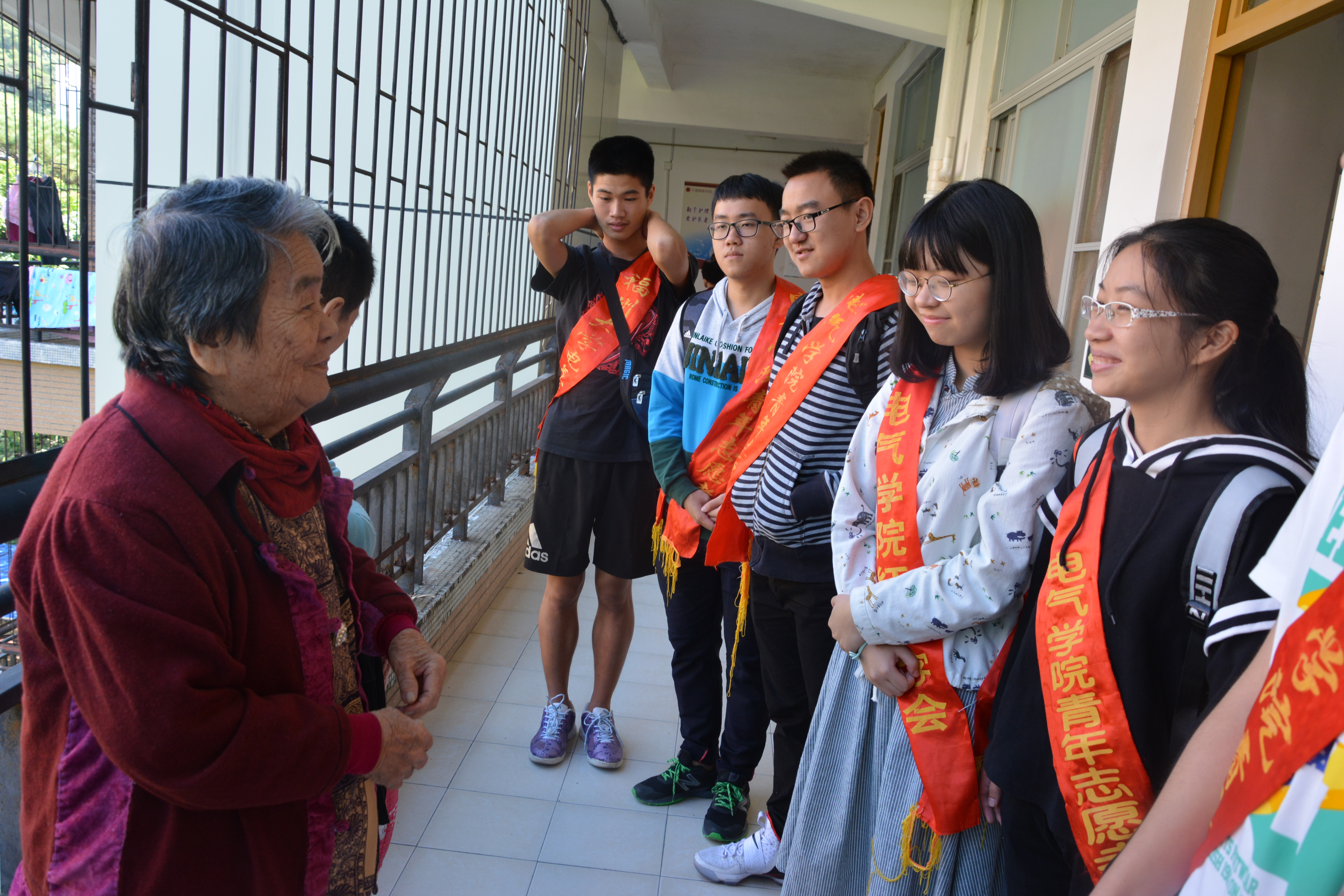 青年志愿者协会带上会旗,挎着绶带,迎着朝阳,朝气满满地来到了五福缘敬老院。