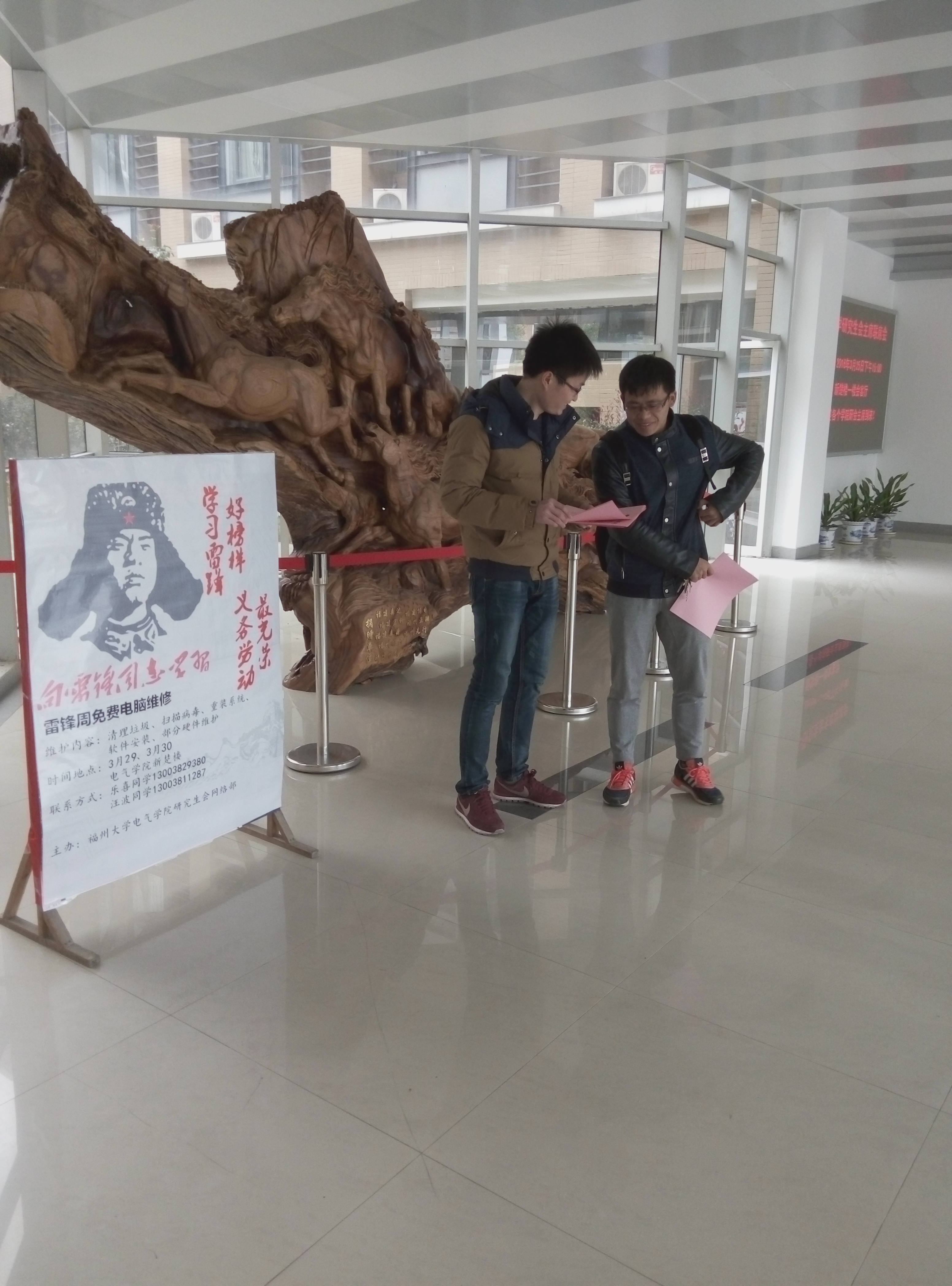 此次公益电脑维护活动,旨在贯彻“两会”精神,并进一步弘扬雷锋精神,以实际行动为全院师生排忧解难,受到了师生们由衷的欢迎和普遍赞誉。这次活动既提高了干部动手能力,进一步发扬了雷锋的无私奉献精神,又让同学们对雷锋精神有了更为深刻的了解,并引导同学们自发地学习雷锋,真正做到“为人民服务”,成为一个有爱心、责任心、感恩心的福大电气研究生。