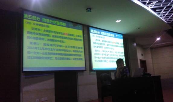 首先,江廷言老师以精彩的演讲对预防盗窃、预防诈骗、预防火灾、预防交通事故、预防意外伤害事故五个方面安全问题进行了详细的讲解。同时通过发生在身边的真实案例,讲授安全问题的重要性,并且播放了各类盗窃诈骗案件、火灾、交通事故等造成诸多严重后果的视频,强调安全防范的重要性。通过生动的案例和视频教学,他要求新生在日常生活中要切实注意以下几个方面:一要时刻牢记安全责任,提高防范意识,学习安全知识;二要保持良好的生活习惯,注意保管好自己的财物和各类证件;三要谨慎参与校外活动,冷静理智待人待物;四要遵守校规校纪,严禁使用违规电器,杜绝安全隐患。