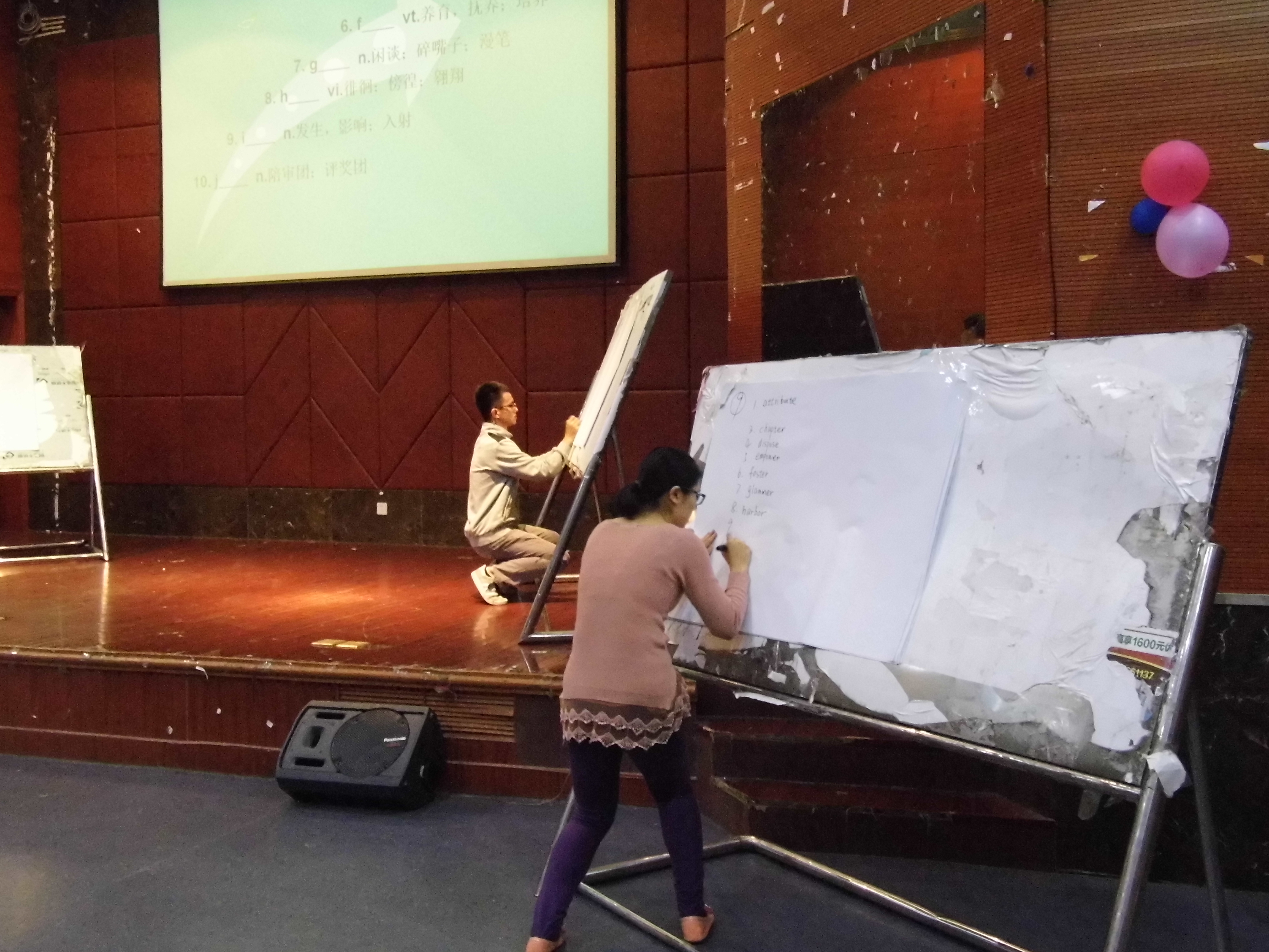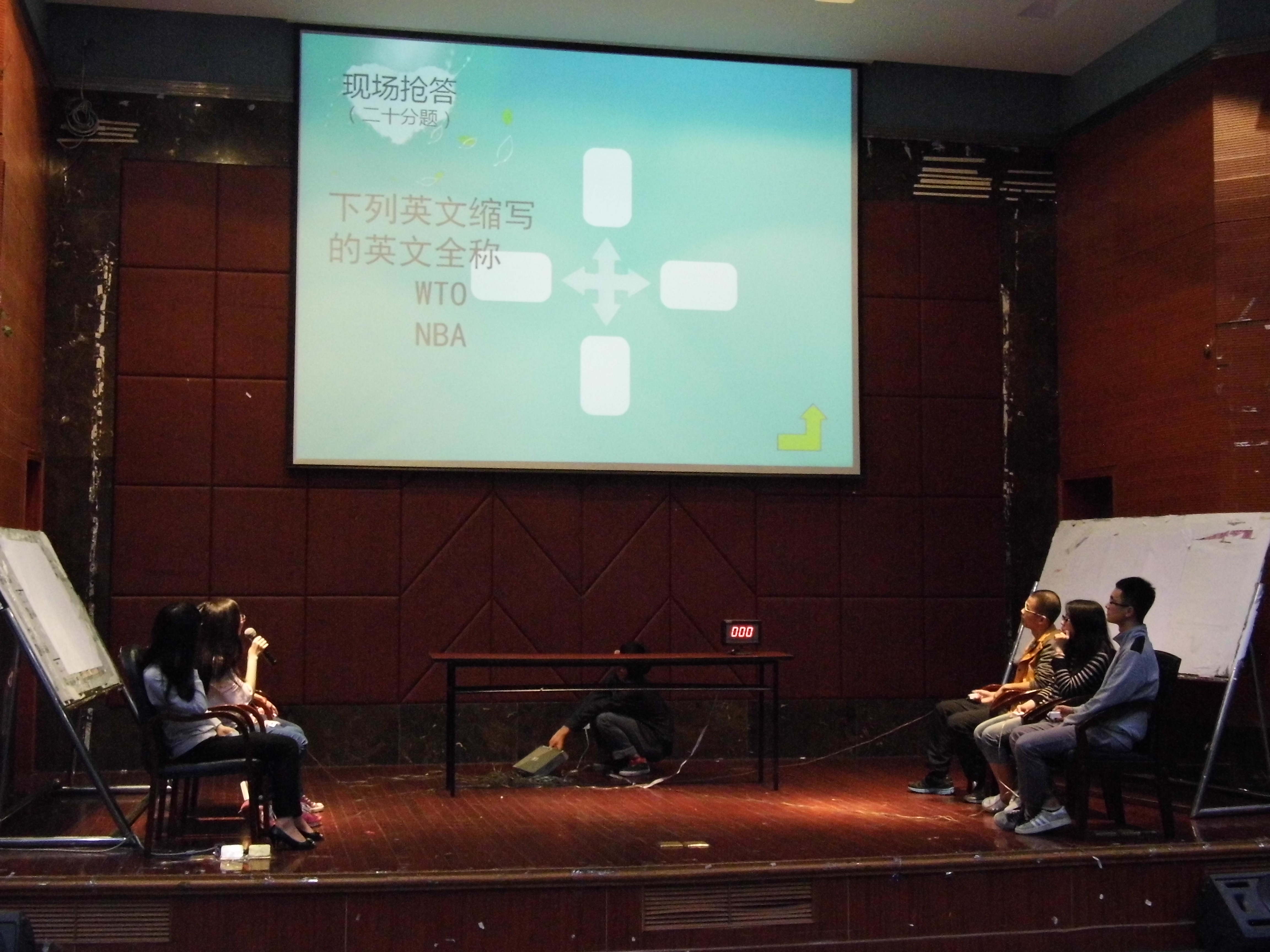 在主持人介绍完嘉宾、选手以及规则之后,比赛在观众们的期待中开始了,第一轮比赛为单词拼写,考验的是参赛选手的拼写和记忆能力。最令人紧张的无疑是第二轮快速记忆单词环节。在短时间内记下规定的词量,而且是在许多观众嘉宾还有对手面前,这对选手的心理素质和记忆力产生了极大的考验,但是选手们展现给大家的却是强大的自信。第三环节为单词接龙,简单的规则却蕴含着不简单的能力。第四轮的比赛是抢答环节,在不同分值的题目的选择上是对选手取舍和判断能力的考验。四轮比赛之后,是有趣的观众互动环节——你比划我猜词。在令人捧腹不禁的比划和令人叹服的猜词能力下,原本冷淡下来的气氛又瞬间热烈,欢笑声不断。最后,来自外国语学院的陈东琳同学获得了一等奖。二等奖被外国语学院的蔡丽丽和成人影视片