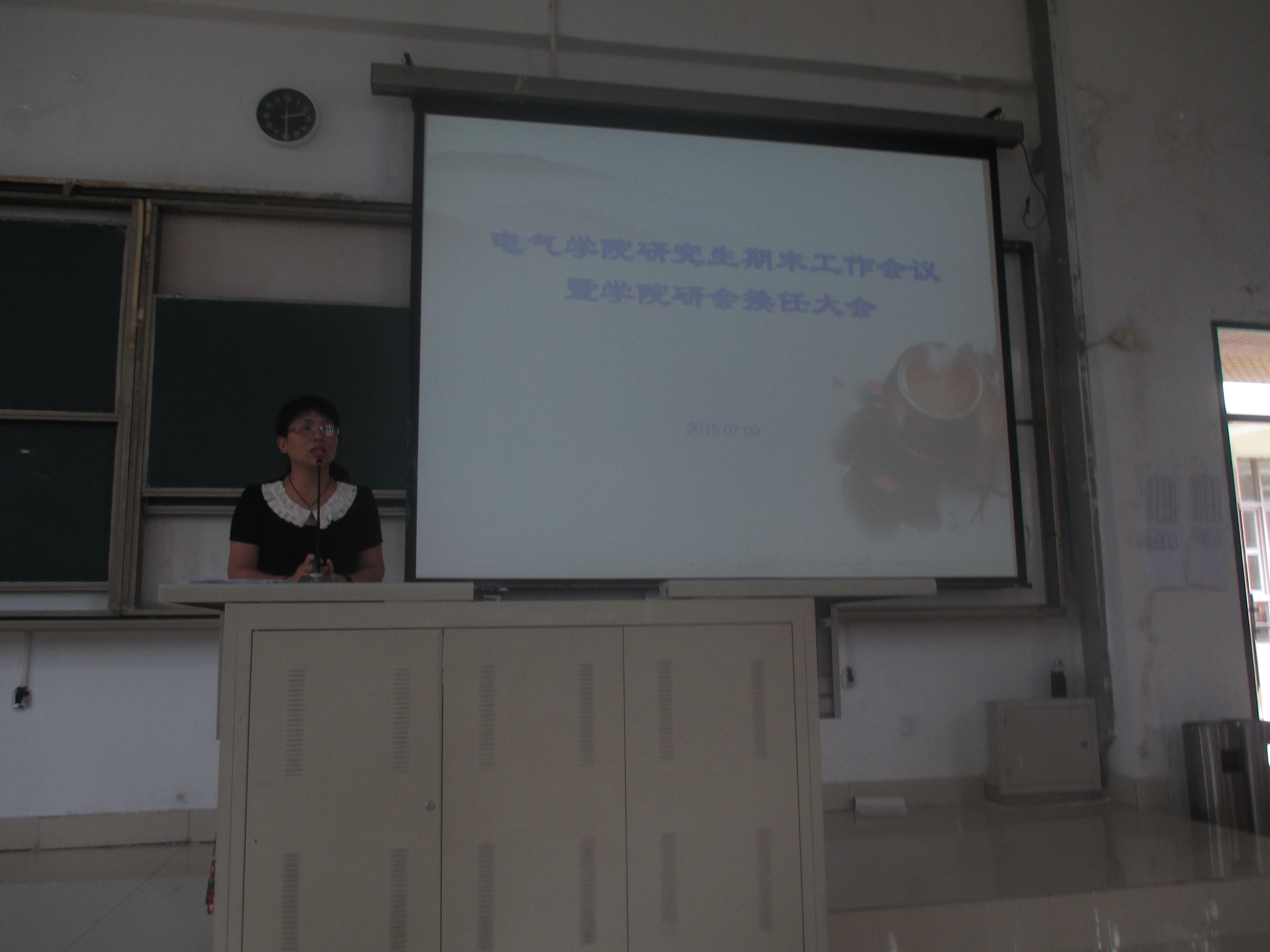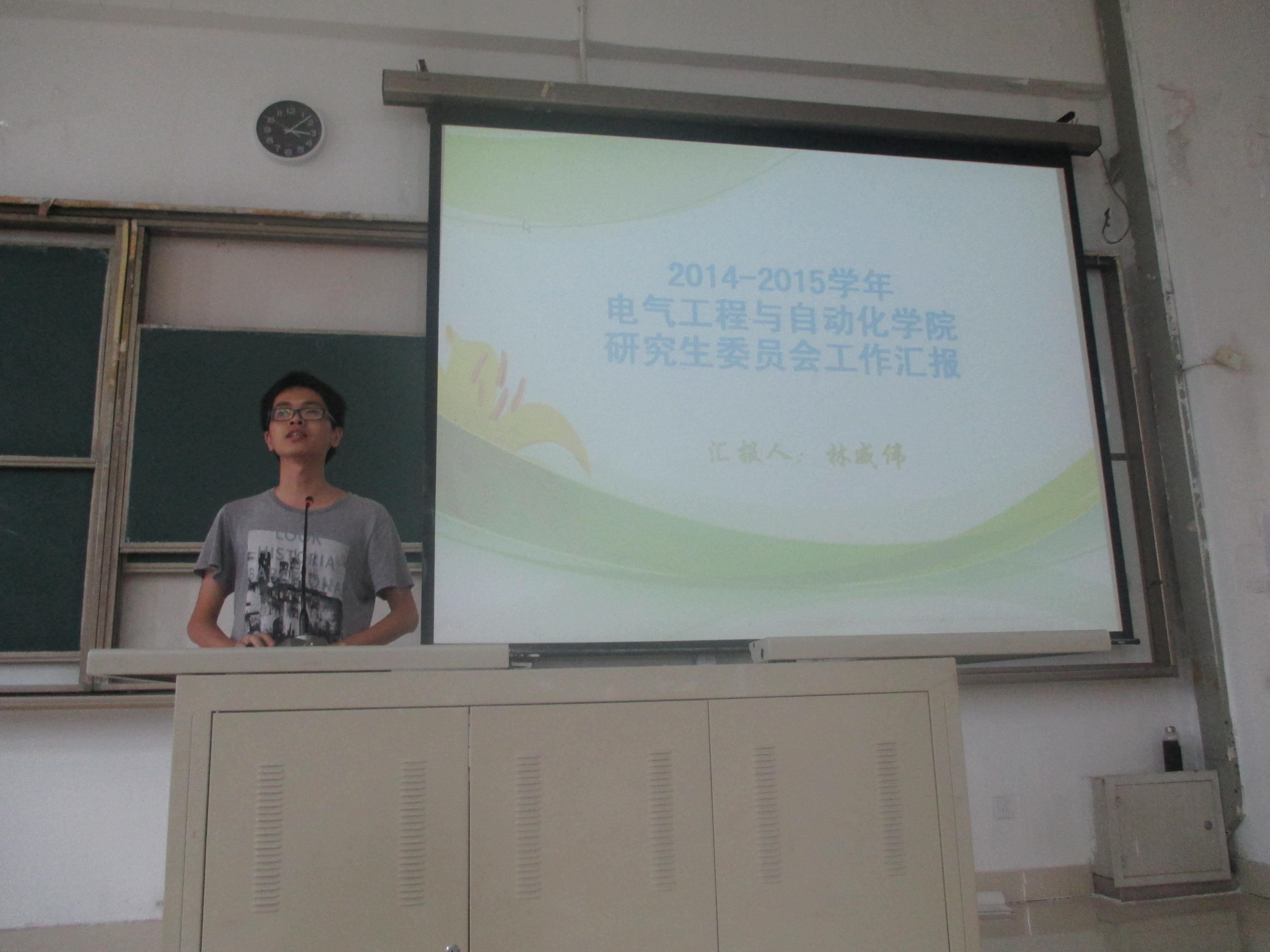 首先,许海燕老师对本学期研究生工作做了简要总结,并进行了暑期安全教育,提醒同学们必须注意返乡安全、食品安全等。同时,强调了下个学期初的一些重要工作。接着上一届学院研会主席林威伟同学代表学院研究生会做了2014-2015学年的研会工作汇报,短短十几张PPT展示了研会斐然的工作成绩,尤其是篮球赛、学术科技月等各项集体活动都顺利落实,取得了丰硕成果。紧接着,新任主席苑新博同学和研会各部长都做了简单自我介绍以及对未来研会工作的展望,新人的亮相引起了同学们的片片掌声。最后,许海燕老师对会议做了总结,对过去一年研究生干部取得的成绩给予了肯定,也希望在接下来的一年时间中,全体研究生继续支持和关心学院研究生工作,争取更上一个台阶。