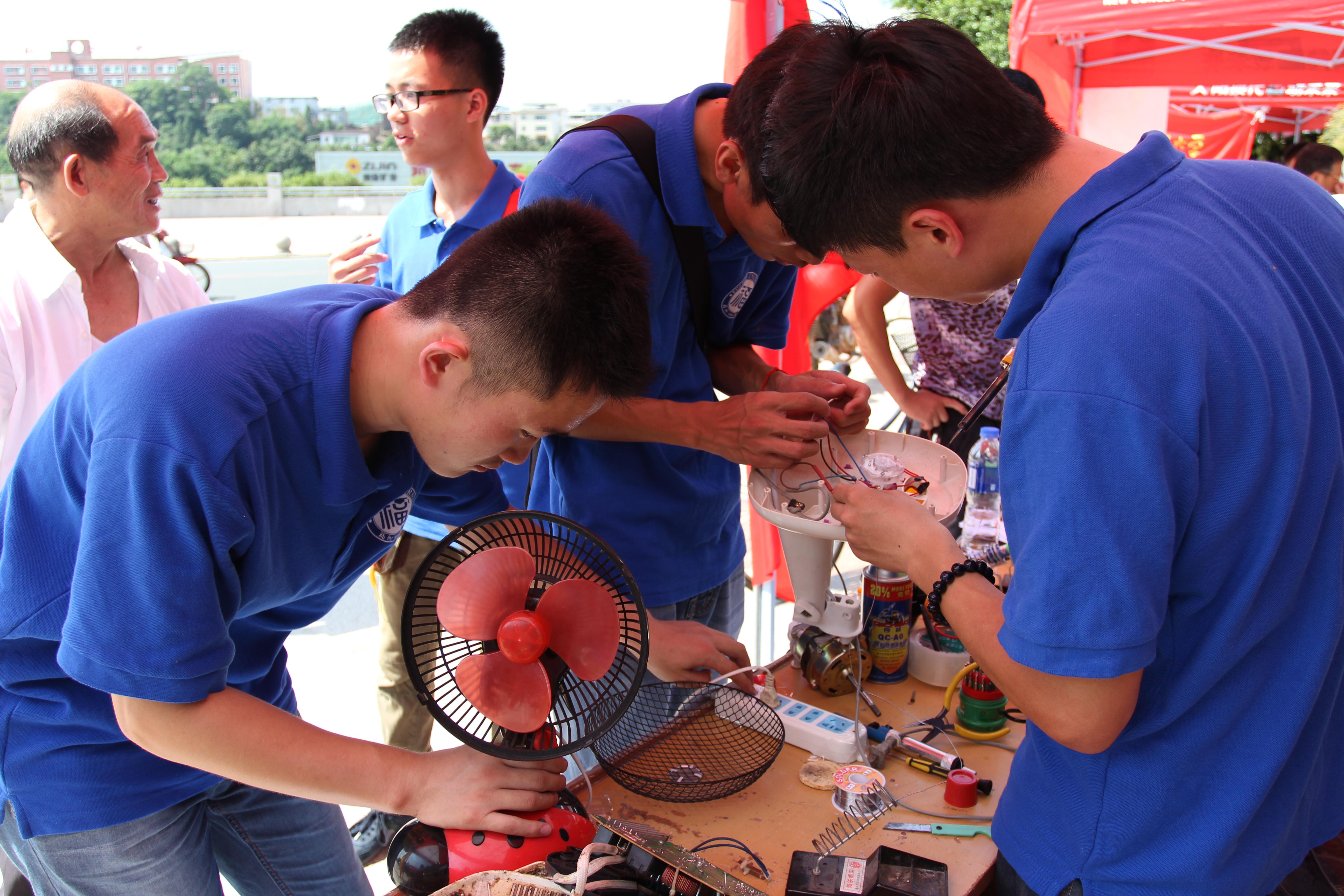 社会实践队在接下来的几天分别在江滨公园、紫金小区、紫金财富中心、天和嘉园开展主题为“义务维修进社区,科技下乡献真情”的暑期社会实践活动。活动期间,实践队采用维修前登记、维修中沟通、维修后回访三者合一的维修工作方法,为小区居民提供免费维修家电服务,共收到维修电器近一百五十件,实践队白天修不完,晚上回宿舍加班加点维修,实践队的这次活动受到小区居民和小区物业高度赞赏。同时,我们实践队的这一活动得到了龙岩电视台的采访,并在《看龙岩》频道进行播出。