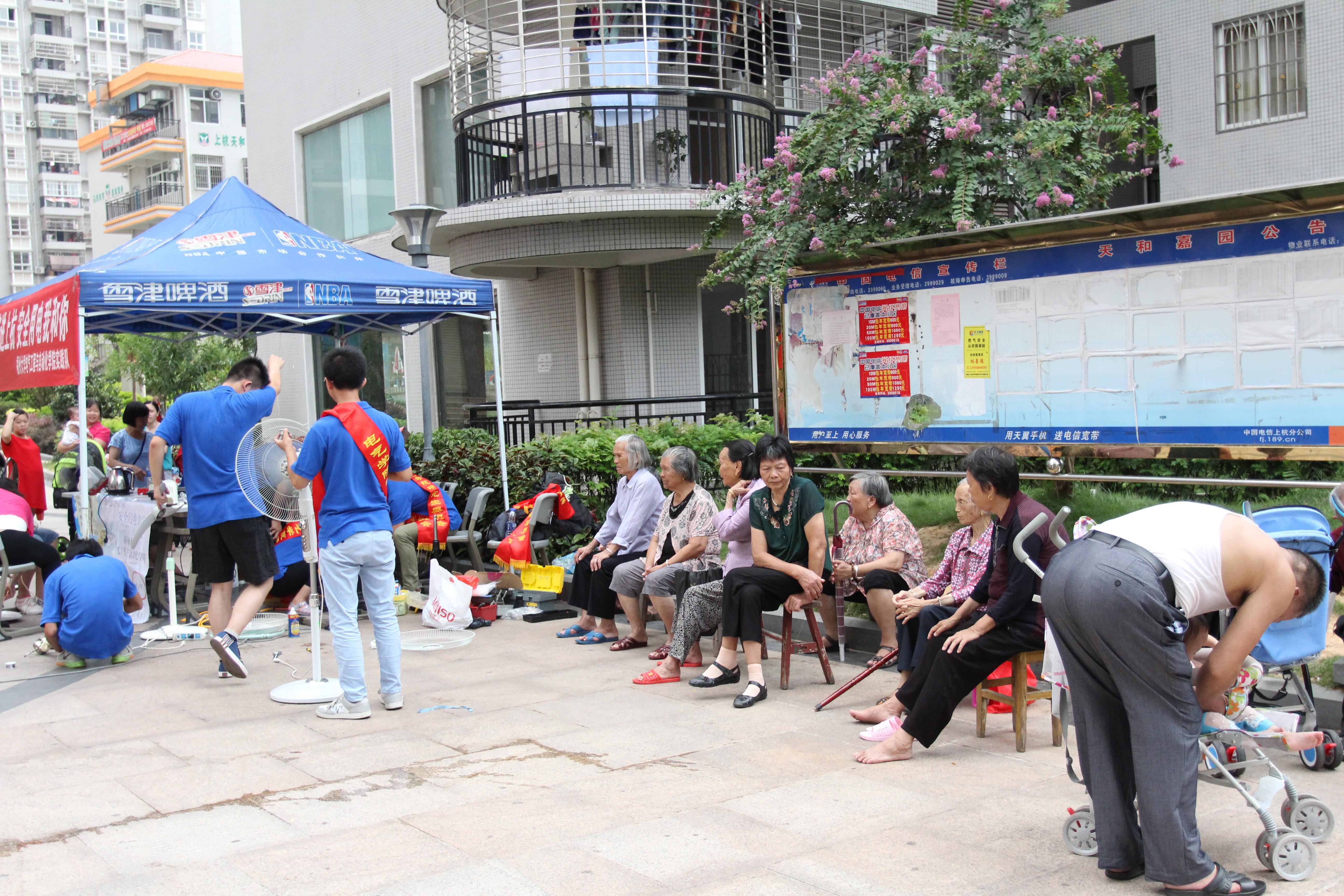 图为天河嘉园小区居民们在维修点附近等待