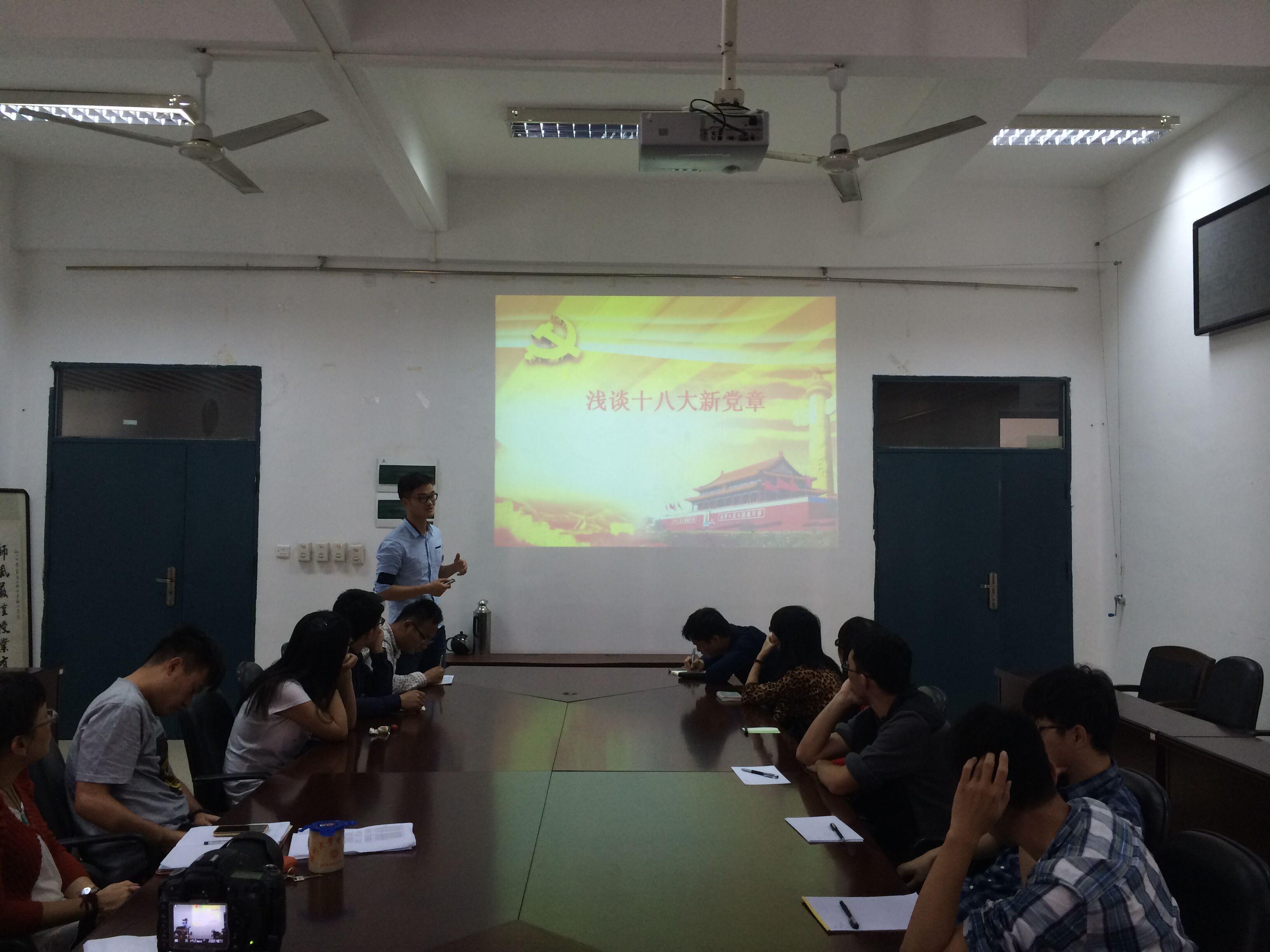 首先,王庭桉同学的党课内容为《浅谈十八大新党章》,主要从打牢党章意识、党章概述、十八大党章的基本内容等三个方面的内容展开学习,并通过设置题目、现场问答的形式对十八大党章进行了深入浅出的讲解。然后,孙岩同学带来了《党的纪律》的主题党课,对党的纪律中的重要法规、纪律分类、基本特征与纪律处分等四个角度作出了较为完整的分析,利用历史上的案例、视频讲解等方式对党的纪律提出了自己的观点。最后,苏志从同志对《党的作风》提出了个人的阐述,运用建党以来的史实材料细致的讲解了党风的内容、党风的意义以及党风的形成,并在结尾结合现在的具体实际对各位同志提出了“讲党性、重品行、作表率”的作风要求。