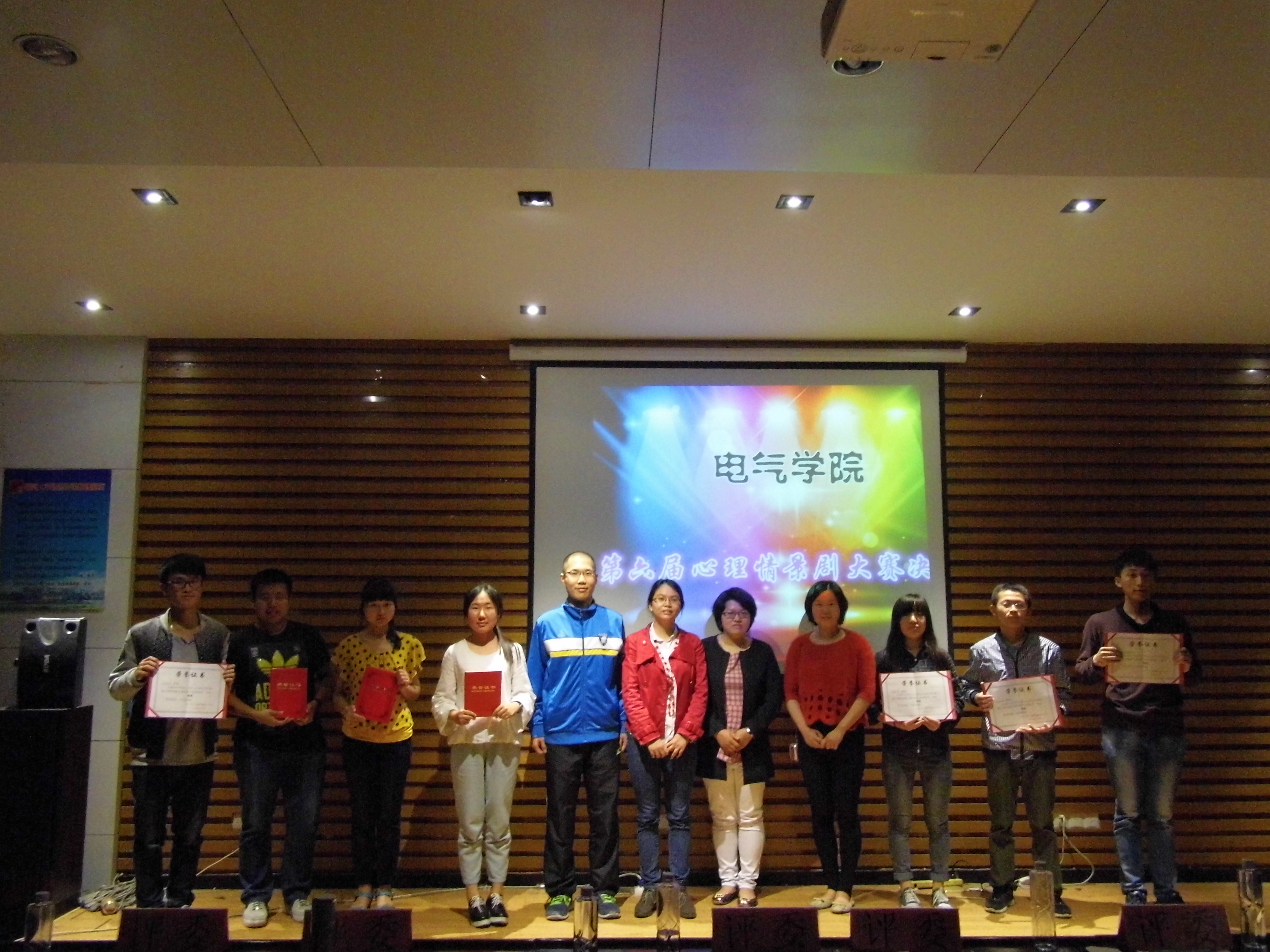 本次心理剧大赛决赛以 “关系”为主题,大赛的评分依据包括剧本、演员表演、舞台效果三个内容。各参赛队伍依据主题,用自己的表现方式为观众献上了一幕幕精彩的剧情。比如第一支队伍(表演“心锁”)一开场就以幽默的表演夺得了现场观众的笑声与掌声。此后,各支队伍都各显神通,现场的气氛一度达到高潮。比赛中又穿插了抢答环节,这使得观众们更加活跃。比赛中最受观众青睐的当属由第三支队伍表演“吴小噜心理小剧场”,它主要讲诉了一个大学生舍弃网络游戏、积极投入大学生活及人际交往中的故事,其中吴小噜扮演者的精彩表演更是深受评委们喜欢。七场精彩的表演过后,评委最终评议出了本赛的冠军——第三支队伍(13级4班、14级4班)。最后比赛在一片掌声中落下了帷幕。