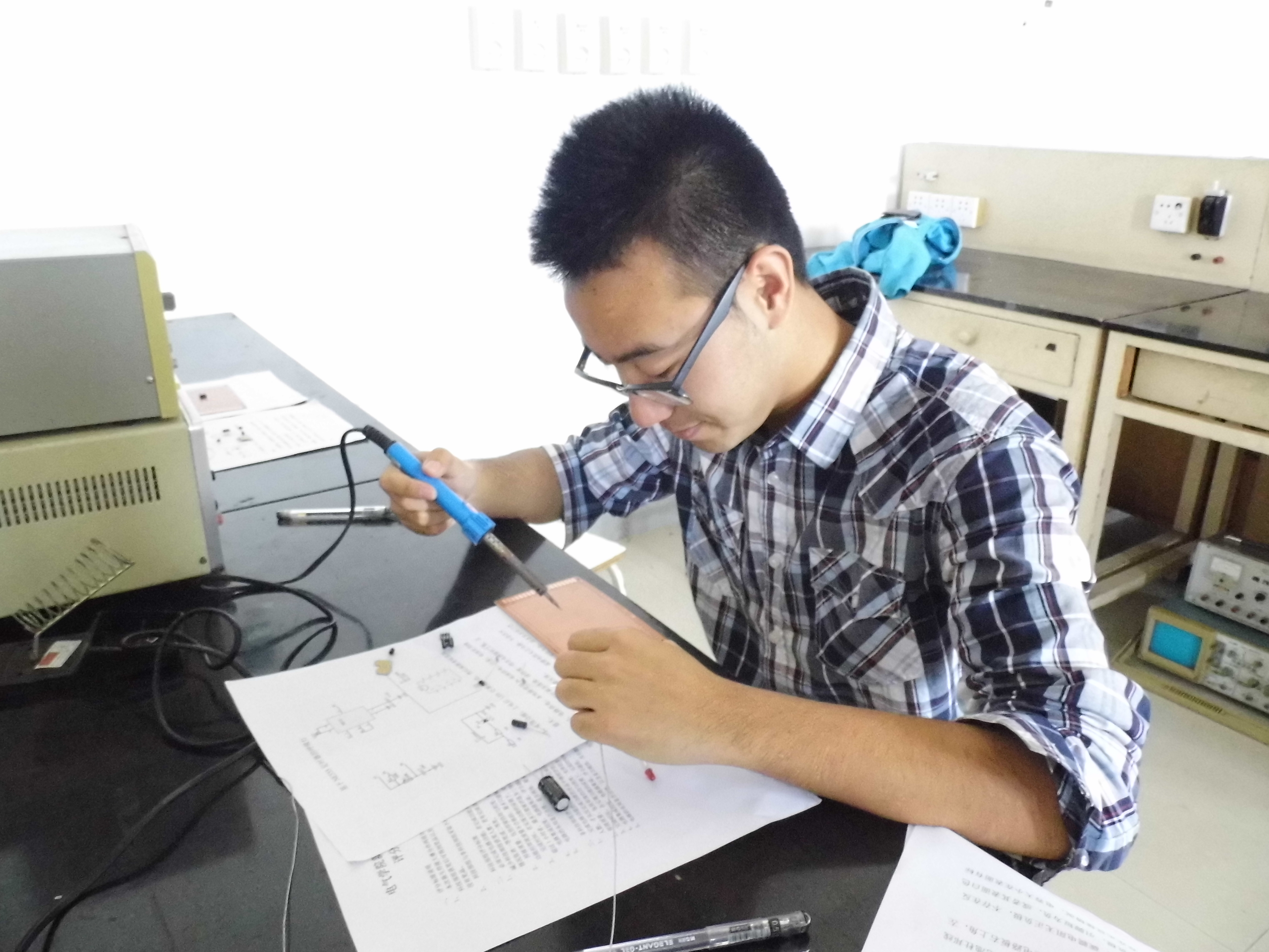 比赛于下午两点正式开始。选手们都早早地来到现场,每个人都焦急地等待着神秘的题目,跃跃欲试摸索着工作台上电路元件及焊接工具。不久,工作人员准时分发比赛电路图,神秘的题目也就随之揭晓。选手们个个专心致志地解读着电路图,在心中逐渐构思出实现电路图的方法。时间一分一秒地过去,选手们在电路板上小心地焊上一个个小元件,一副完整的电路渐渐浮出台面。选手们有的得心应手地做着,有的则是忙得焦头焦头烂额。当然,在选手们专心焊接电路的同时,工作人员也没有闲着,他们四处巡视并解答着选手们的疑问。经过一个半小时动脑及动手的考验,选手们相继完成了自己的作品,比赛也迈入了尾声。本场焊接比赛评奖分为科技部和非科技部两部分,最后,非科技部一等奖为吕奕兰和黄鑫同学,科技部一等奖为林登豪同学。