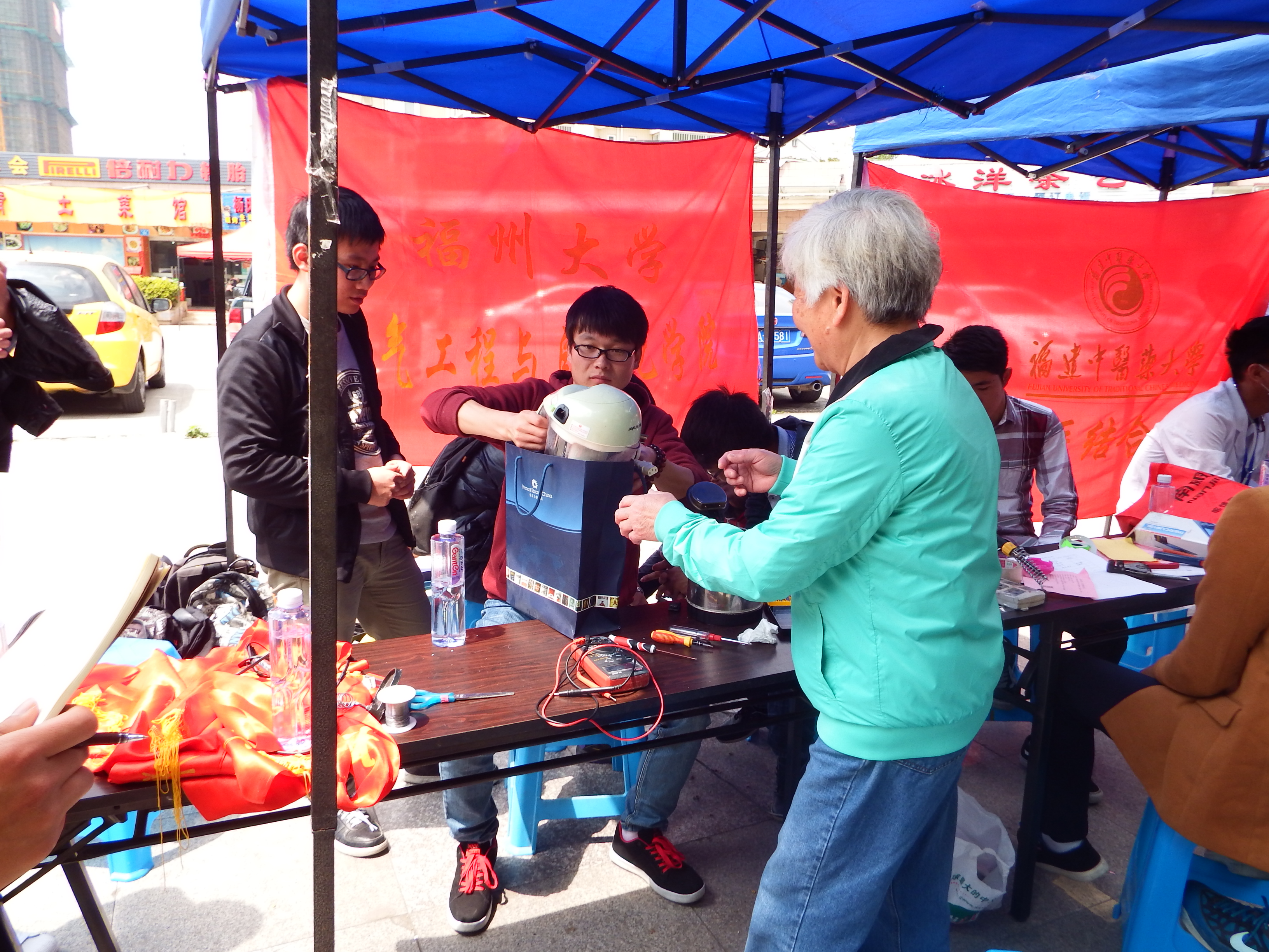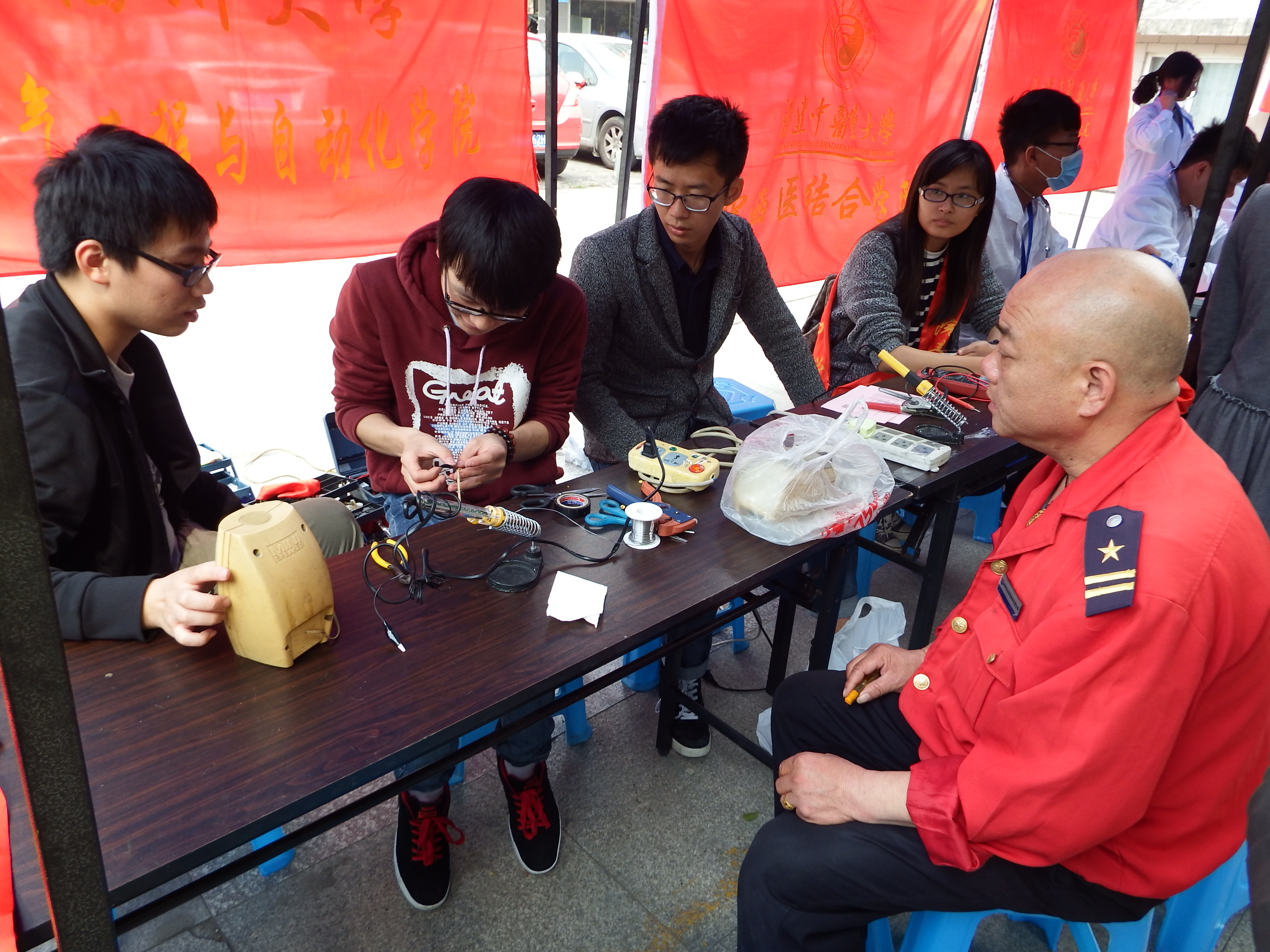 由于学院提前来到社区进行过宣传,活动一开始立即吸引了许多咨询的群众,他们对学院的活动感到新奇,有一些大叔大妈拿起手机开始拍摄学院的宣传横幅以及维修过程。第一位前来维修的是位保安大叔,他带来了一对音箱,这对音箱看起来有些年头了,或许是寄托着许多回忆与感情,大叔一直不舍得扔掉,因为太过于年旧,接头与现在的主流接头不兼容,维修人员耐心将电线拨开,细心地接了回去,大叔见到自己的音箱又可以使用了,显得非常高兴,临走前不住地说谢谢。随着时间的推移,来的人也越来越多,附近的许多居民都拿出了自己损坏的家电:如电饭煲、豆浆机、电吹风等。电饭煲与豆浆机里含有高度集成的电路板,不过维修人员依然靠着扎实的专业知识将它们修好。