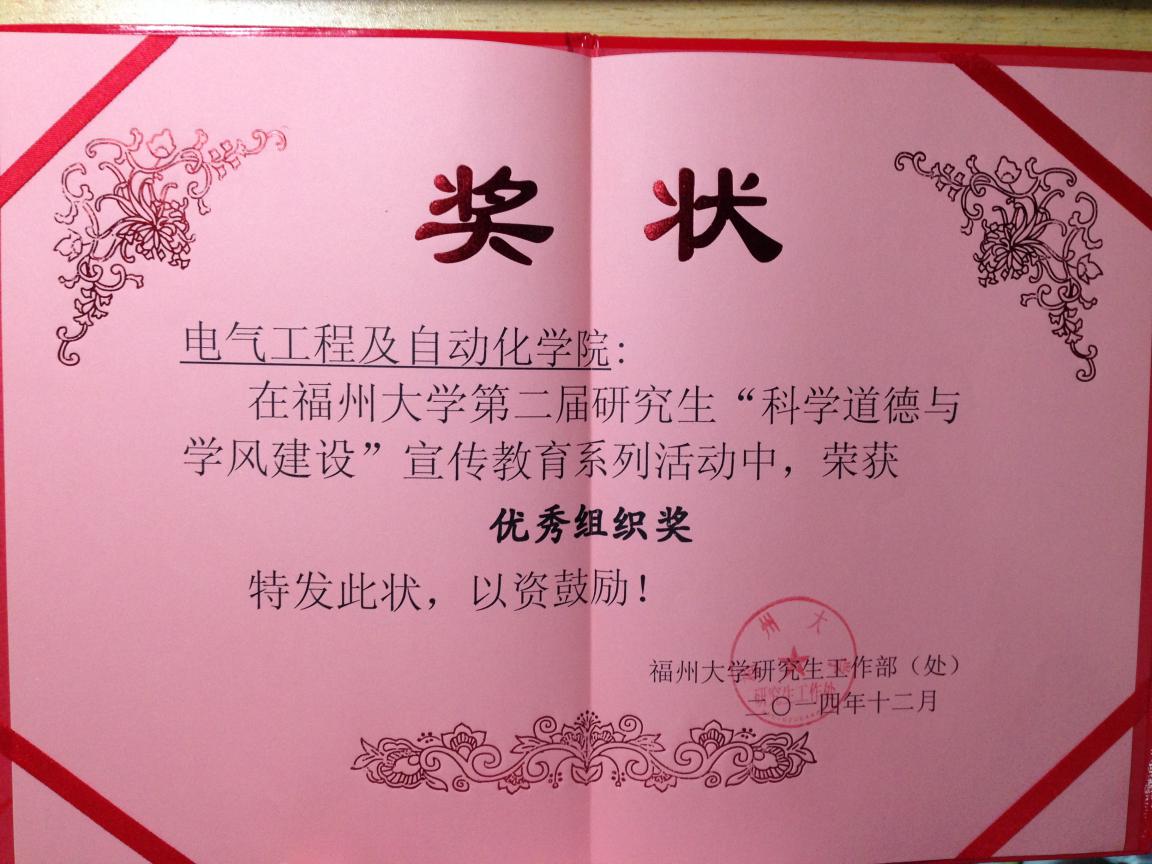 本次活动成人影视片 共有两名选手参加,分别是2013级的张思彦同学与2014级的葛钊同学,经过层层的选拔与激烈的竞争,最终成人影视片 两名选手均在比赛中获得三等奖的好成绩。与此同时,电气工程及自动化学院在成人影视片 第二届研究生“科学道德与学风建设”宣传教育系列活动中,荣获“优秀组织奖”。