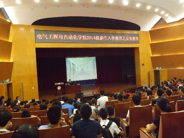 保卫部的江延言老师作为主讲人,为到场的2014级电气新生们上了一堂风趣生动的安全教育课。