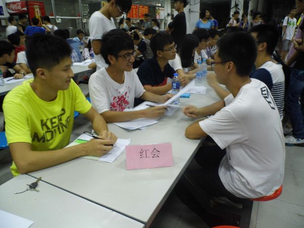 学生会各部门按事先排定的顺序在指定位置布置好场地。纳新的形式主要是面试,即由学生会各部部员对前来“应聘”的2014级新生进行相关考核。新生按班级顺序进场后,就在犹豫和徘徊中,在激动与紧张中,做出了他们进入大学后的第一个重要决定。现场的气氛随着一波又一波的新生的入场而不断起伏,其实,和新生一样激动的还有那些面试的“考官”,他们中有很大一部分也是去年才经历过这样的场面,一样的面试,不一样的感受。随着一个个新生意犹未尽的离开,今年的纳新活动也就此告一段落。