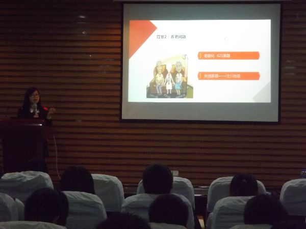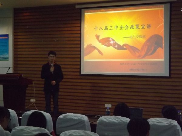 学生会主席曾蕴华发言,强调了十八届三中全会决定的“单独二胎”政策对于90后的重要性。随即进入了宣讲会的主要环节——翁佳妮宣讲员向同学们分析“单独二胎”政策。首先,她将十七大报告和十八大报告与十八届三中全会的决定作对比,得出了十八届三中全会多出了“启动实施一方是独生子女的夫妇可生育两个孩子” 的决定。然后,她分析了国家启动这一政策的背景——生育率降低显著、养老问题加剧和为失独家庭考虑。最后,她还讲解了社会不同人群对这一决定的不同看法。