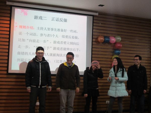 本次活动由研一两位幽默风趣的男同胞主持。活动以游戏为主,表演为辅,包括以下四个有趣的游戏:首先开场的游戏是“击鼓传花”,即一人击鼓全场观众参与,一下子把全场气氛调动起来;接着是“正话反做”的游戏,观众们都很积极参与,既展现了女生的魅力,又娱乐了大家的心情;然后是最具童真趣味的“萝卜蹲”游戏,游戏中参与者们表现的各种滑稽动作,逗得观众们大笑不止;最后一个游戏是“你拍我接”,男女两人一组搭配,其中一人手拿羽毛球拍,另一人手拿垃圾桶在5米以外接球,比赛过程中,默契度一组高过一组,赢得观众们的连连喝彩。游戏期间,特意为女生们准备的抽奖环节及礼物,令在场女孩子们欣喜不已;还有男生们倾情演唱的歌曲以及精彩的吉他演奏节目,也为这次活动增添了很多欢乐。