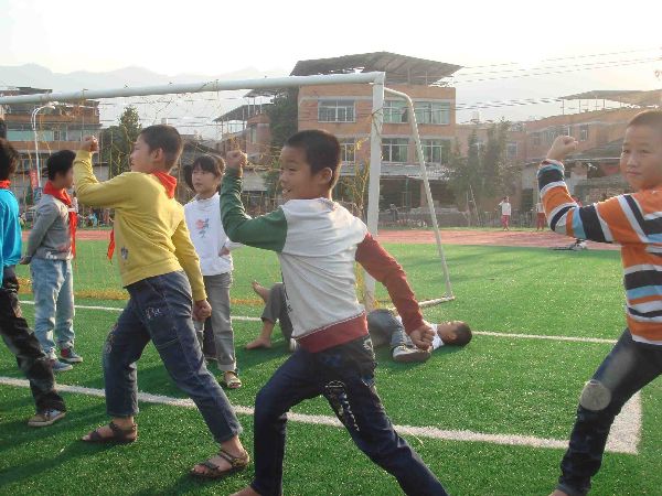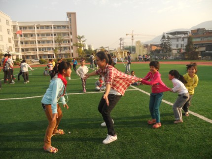 刚走进学校大门,一群欢乐的小学生将志愿者们团团围住,满心好奇的和志愿者们聊起了天。不难看出,对于这些陌生的大哥哥、大姐姐的到来,小朋友们打心里高兴。今天,志愿者们要给他们上的是一节体育课。在领着小朋友们绕操场上跑一圈,作了简单的热身运动后,随之,志愿者们将小学生分为男女两拨人进行游戏。小女生们组成一队,玩起了老鹰捉小鸡这一经典的游戏,孩子们在志愿者充当的“老母鸡”身后欢快奔跑、嬉笑连连。而小男生们则在刚参加完军训的新生志愿者带领下练起了军体拳,一招一式像模像样。欢乐的时光悄然流逝,一节课的光阴很快过去了,支教活动在孩子们不舍的“再见”声中结束。