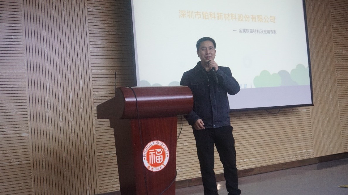 最后,铂科公司罗涛总经理为同学们做了公司介绍和技术报告。从2009年公司成立,到2019年于深交所上市,铂科公司通过自主创新,完全掌握了铁硅、铁硅铝等从粉末研发、制造、绝缘,到成型的整个金属磁粉芯全制程体系及核心技术。基于对金属软磁材料特性的深度研究,通过与光伏逆变器、新能源汽车及充电桩、变频空调、不间断电源、信息通讯等电力电子行业知名企业的深度应用合作,已完美架构从金属磁粉芯生产、销售到磁元件设计的一站式金属磁粉芯服务平台。罗总经理依托于自身的深厚理论知识和广阔的行业视野,为同学们展示了前沿发展的大趋势,丰富了同学们的专业知识和学科素养。