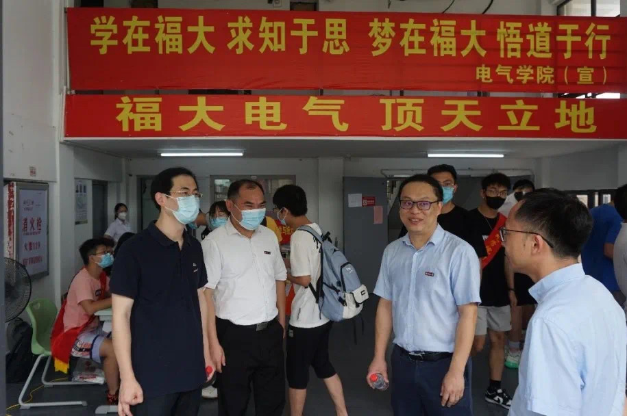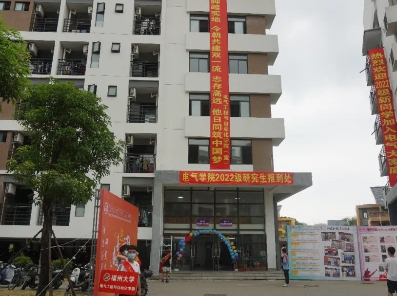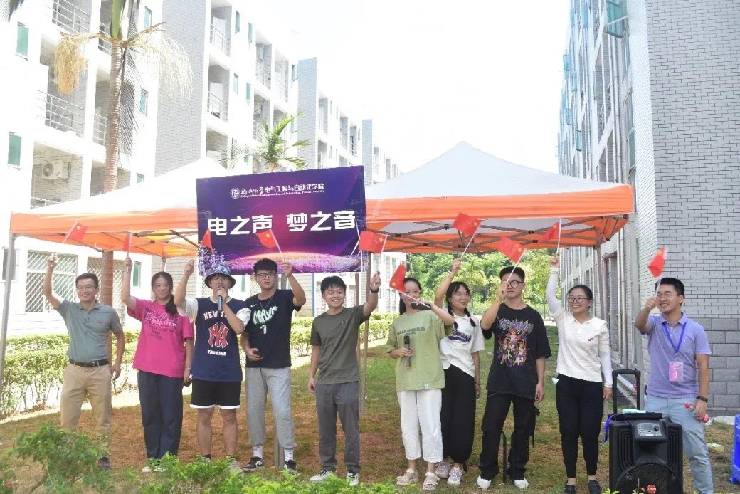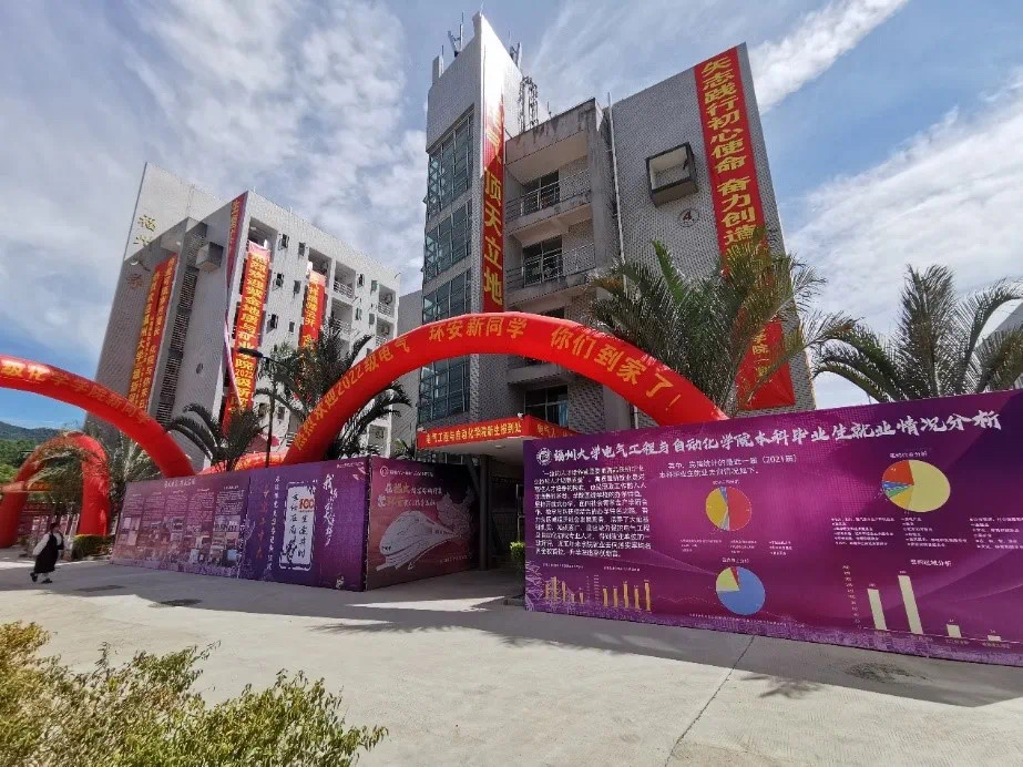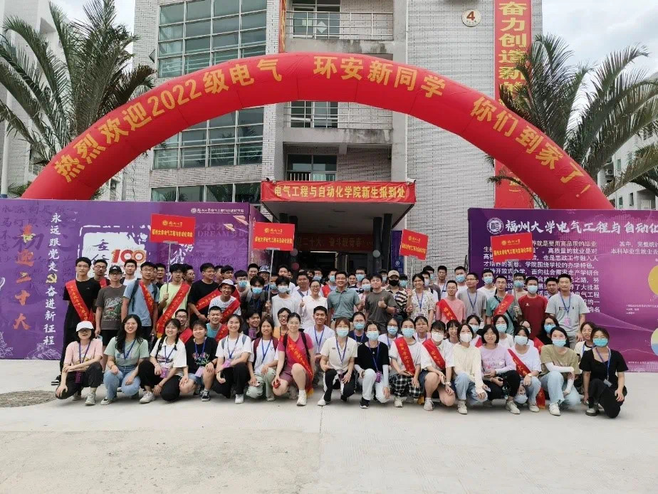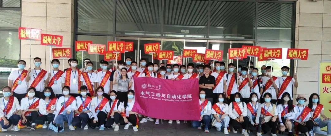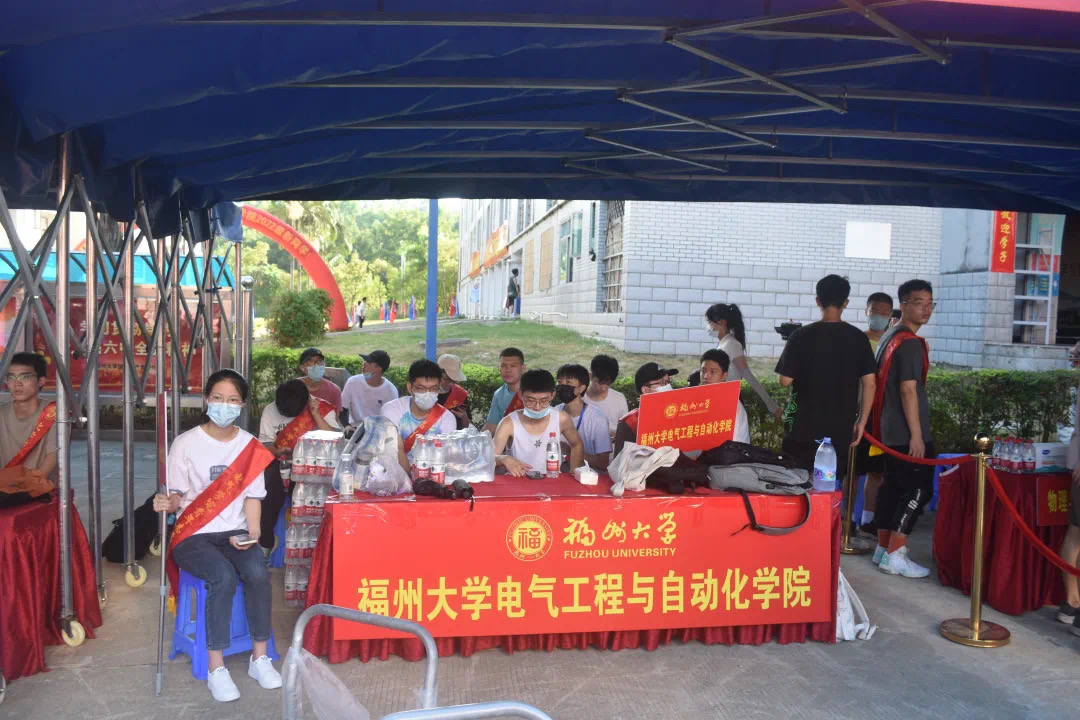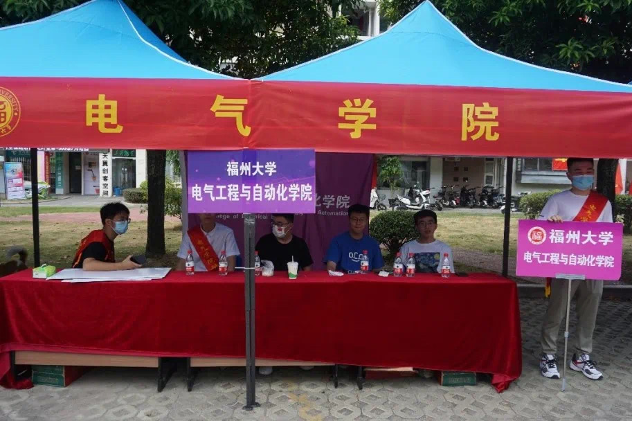 标志牌,舟车劳顿的疲惫感在这一刻消失殆尽,取而代之的是找到归属的激动与憧憬。这两天的福州虽然依旧烈日炎炎,但全体电气师生的热情更胜一筹,电气人的凝聚力在这时得到了充分体现,新生的大学篇章在最伊始就到达了高潮!