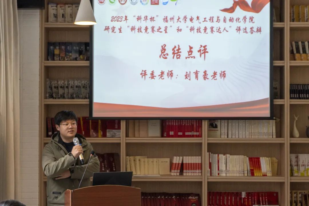 最后,刘育豪老师对本次评选答辩会做了精彩总结与点评。首先,刘老师对本次答辩选手们的科技竞赛成果和答辩表现给出了高度赞扬。接着,刘老师从自身参赛经历出发给选手提出了一些宝贵的建议。他提到要想取得优异的成绩,就要努力提升对赛事的抗压能力、与团队的协调与沟通能力以及对细节的精准把控能力。总结与点评的最后刘老师鼓励全体同学积极参加科技竞赛活动,在体验和享受的过程中不断突破自我,用优异的成绩为成人影视片
