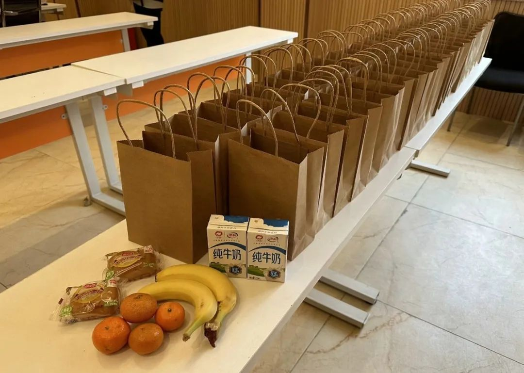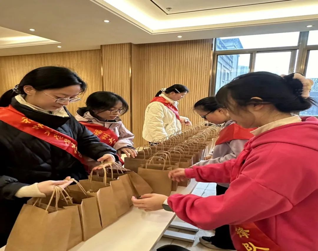 志愿者们身着绶带,细致地分装了一份份满载心意的慰问小礼物,包括香甜的牛奶、松软的面包和新鲜的水果等,为老人们精心布置了一个充满温馨的慰问场地。他们轻轻地引导、搀扶着老人们入座,并用温暖的话语向他们致以亲切的问候。