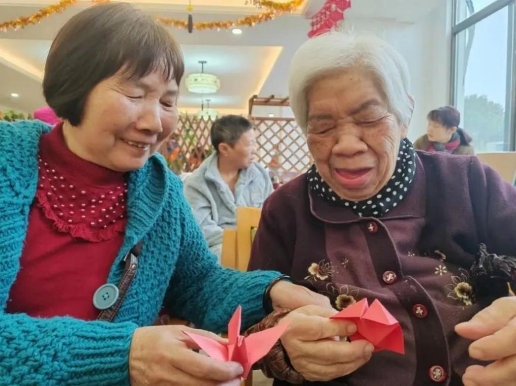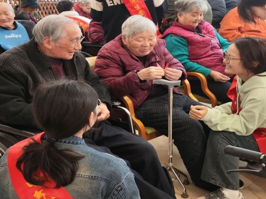 表演结束后,志愿者们与老人们围坐在一起,共同折纸、聊家常。他们通过手工制作的千纸鹤,传递了对老人们健康长寿、吉祥安康的美好祝愿。老人们也兴致勃勃地回忆起年轻时的风采,与志愿者们分享那些珍贵的经历和趣事。他们鼓励志愿者们保持积极乐观的心态,奋发向上,追求更美好的未来。聊天接近尾声,志愿者们将事先分装好的礼物发放给各位老人,并送上了自己的祝福。
