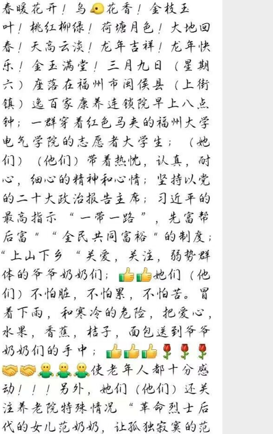 “春风三月宜敬老,雷锋精神永传承。”本次敬老志愿活动不仅展现了电气学子的精神风貌和奉献精神,也为社会注入了一股暖流。通过走进社会的一角,我们深刻体会到了尊老爱幼、传递爱心的重要性。让我们继续发扬“学习雷锋好榜样”的精神,怀大爱、懂奉献,为构建和谐社会贡献自己的力量!