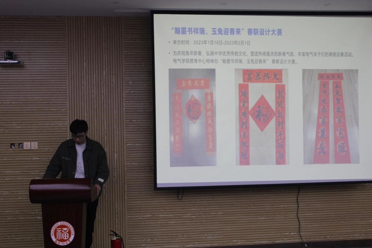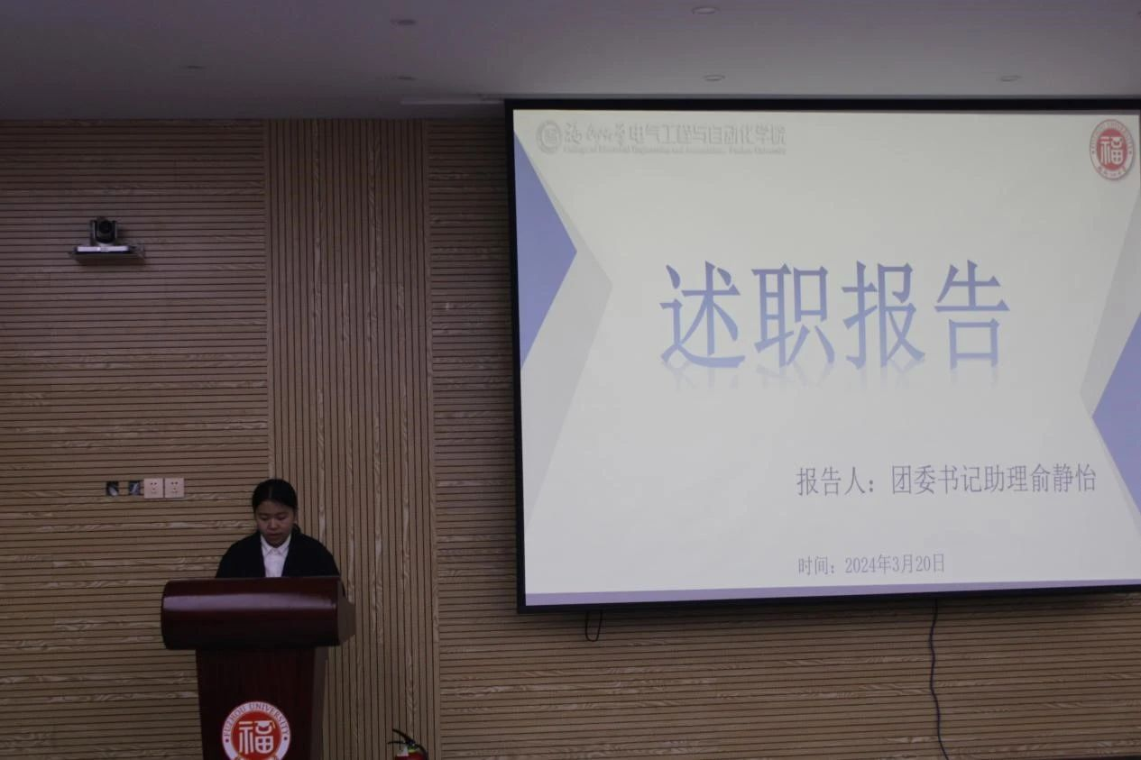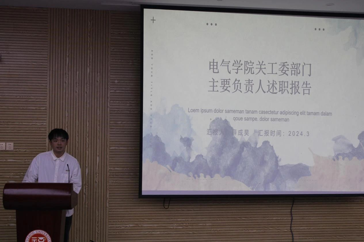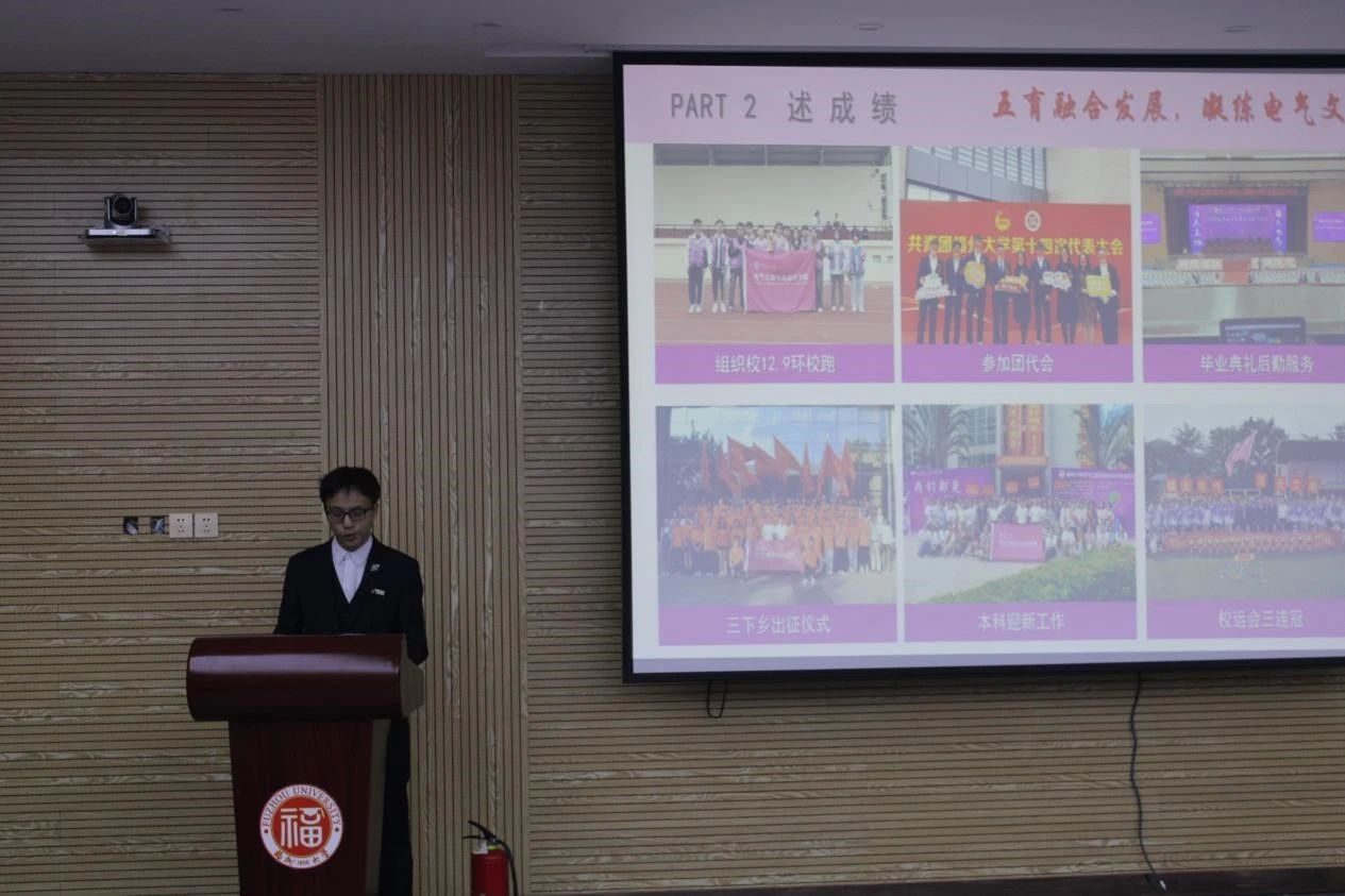 第四届团委学生会主席团成员逐一上台,详细汇报了过去一年的工作成果与经验。一年来,主席团成员围绕“五育并举,树人育才”的理念,牢记“无体育,不电气”的精气神,积极办好体育赛事;“求知创新,躬身实践”科创比赛佳绩频传,智育建设常长常新;秉持“以‘美’塑心灵,育‘向美’之才”丰富文娱,涵养美育;“萤火虽微,愿为其芒,不啻微芒,造炬成阳”传唱志愿之歌与德育建设;“多元媒体载体,讲好电气故事”宣传工作拓宽视野,展望世界之窗。