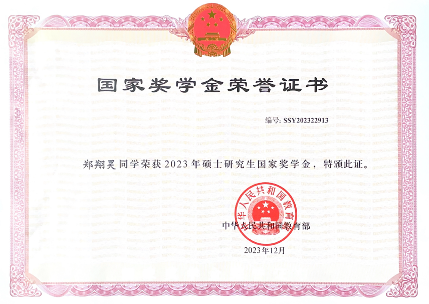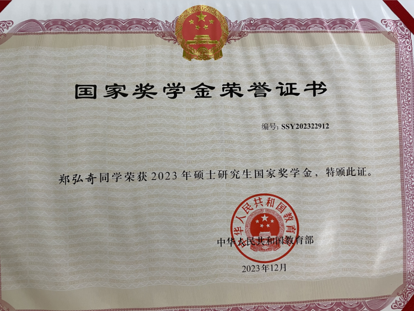 综合奖学金,两次获得国家励志奖学金,以较高的学业成绩排名推免保研本校。研究生期间,郑弘奇始终延续本科勤勉刻苦,态度端正,对待学业一丝不苟的精神,各科成绩均名列前茅,专业排名第一,获得国家奖学金、成人影视片