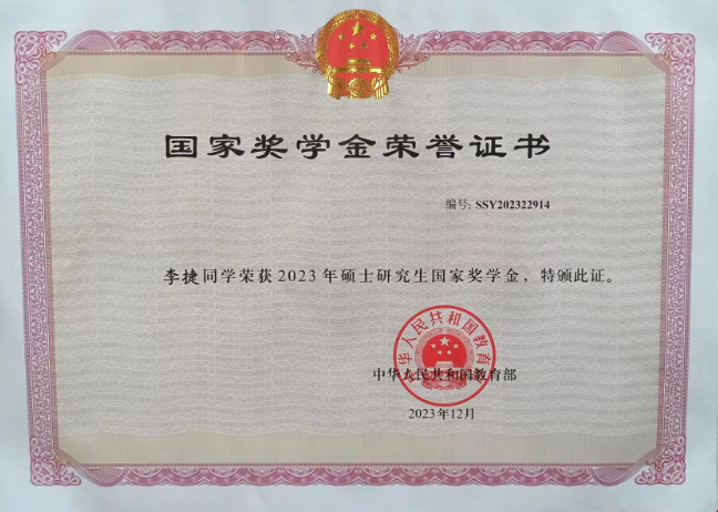 自研究生入学以来,李捷深知在研究生学习阶段,无论是专业理论知识的学习还是科研工作,都需要以更高的标准要求自己。从研一开始,李捷就认真学习专业知识,秉持精益求精的学习态度,积极探索适合自己的学习方法,提高学习效率。在明确目标的指引下,他坚持不懈,认真钻研,与同学交流课程上所学到的知识,相互取长补短,积极向老师请教课程学习中所遇到的问题难点,巩固所学知识,最终以优秀的成绩完成了学院规定的各项课程,研究生期间学业平均成绩87.83分,部分课程成绩达到90分以上,并获得研究生国家奖学金、成人影视片
