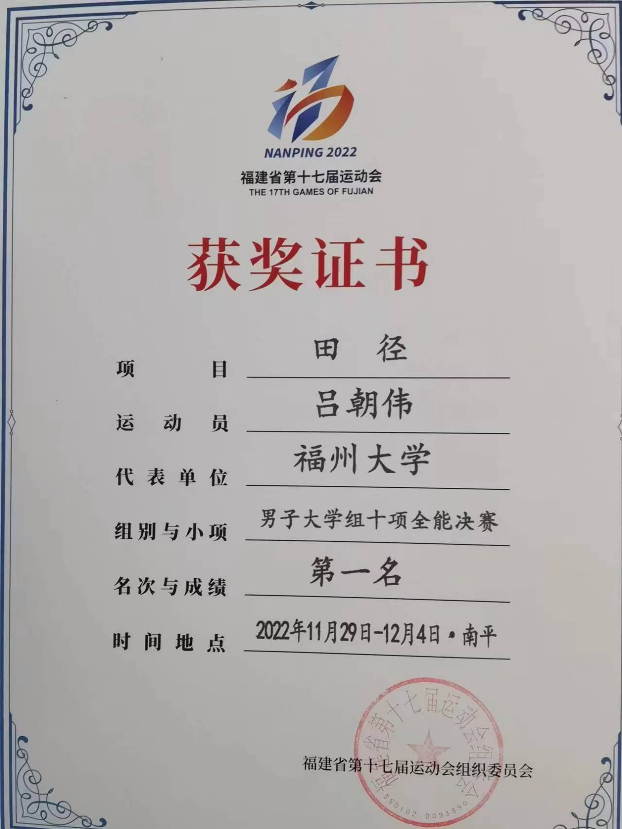 对于吕朝伟而言,日常体育训练不仅是为了提升体能和技巧,更是一个磨练意志、挑战自我的过程。他深知,想要在赛场上取得优异的成绩,背后必然伴随着辛勤的努力和汗水的付出。因此,无论是力量训练还是耐力训练,他都认真对待,从不懈怠。正是这份坚持和毅力,让吕朝伟在赛场上屡创佳绩。他凭借出色的表现,荣获了福建省第十七届省运会十项全能冠军、省运会体育道德风尚奖等一系列荣誉。这些荣誉的背后,是他无数个日夜的辛勤付出和坚持不懈的努力。在赛场上,吕朝伟总是充满斗志和激情。他敢于挑战自我,不断突破自己的极限。每一次比赛,他都全力以赴,以最好的状态迎接挑战。即使面对强大的对手和艰难的比赛环境,他也从不退缩,总是以坚定的信念和顽强的毅力战胜困难。他坦言,作为非职业运动员,参加比赛更多是为了挑战自我、超越自我。面对比赛中的压力和挑战,他总能保持轻松的心态,以饱满的热情和坚定的信念去迎接每一个挑战。他相信,只要做好充分的准备,保持专注和毅力,就一定能够克服困难,取得优异的成绩。