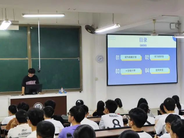 叶立炜同学首先向新生详细介绍了扬帆计划及实习的好处。他指出扬帆计划是帮助在校大学生熟悉真实的工作环境,明确职业方向,不断提高社会化能力和综合就业能力的就业引导计划,主要实习单位覆盖各行各业。参与扬帆计划,可以锻炼同学们各方面的职业能力,收获丰富的实习体验。随后他向同学们分享了岗位选择的建议和简历制作的技巧,并就如何参加扬帆计划的大致流程向同学们做出了详细介绍。