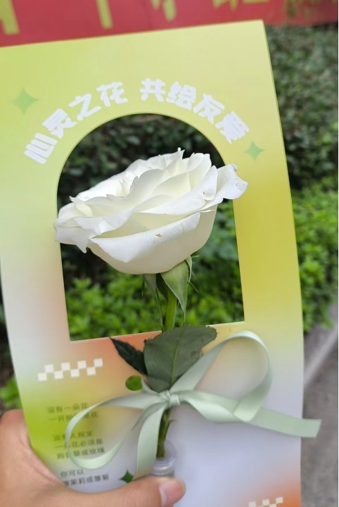 参与者在卡片上写下自己身边温暖、治愈的故事或一段鼓励他人的话语,将卡片挂在展板上。随后,在卡片旁绘制一张彩色笑脸,传递正能量。完成这两个环节后,即可领取一枝象征着纯洁与和平的白玫瑰作为回馈。用文字、色彩和花朵,共同创造一个充满正能量和美好祝愿的空间。