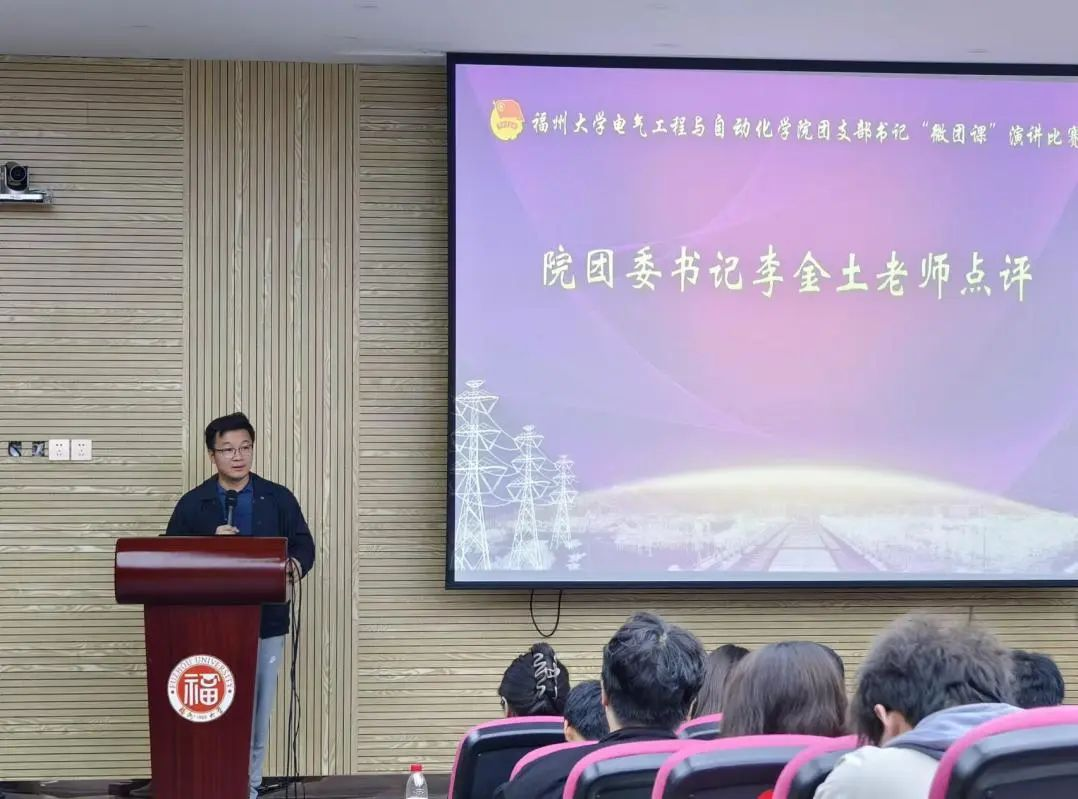 最后,院团委书记李金土老师为本次活动进行了点评。李金土老师首先肯定了各位团支书的参赛积极性和认真备赛的态度,随后从演讲技巧、PPT制作、内容选定等方面提出指导意见,鼓励各团支部书记继续努力,以更加饱满的热情与扎实的能力投身于团支部建设,引领广大同学在新时代新征程中奋勇前行。